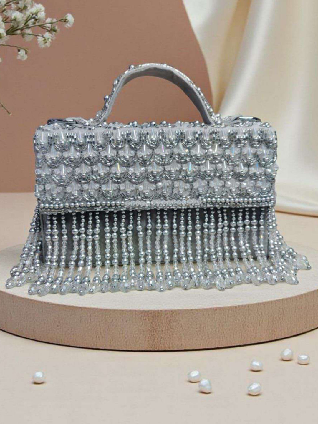 Art Silk Wedding Clutches in White and Off White with Moti work