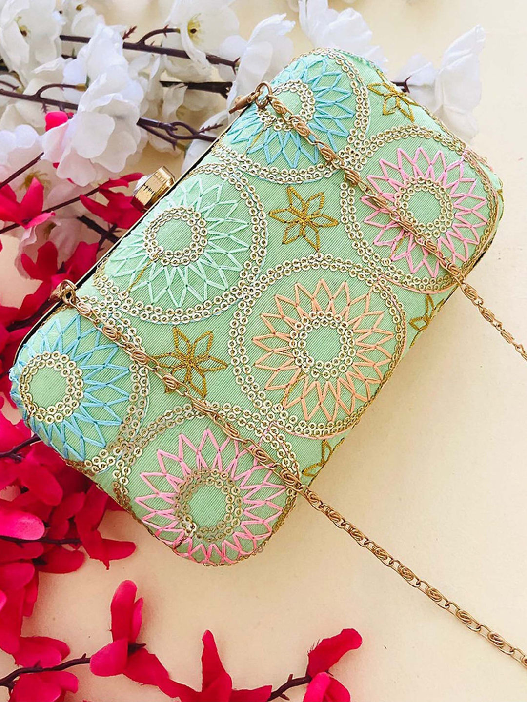 Art Silk Festive Clutches in Green with Embroidered work