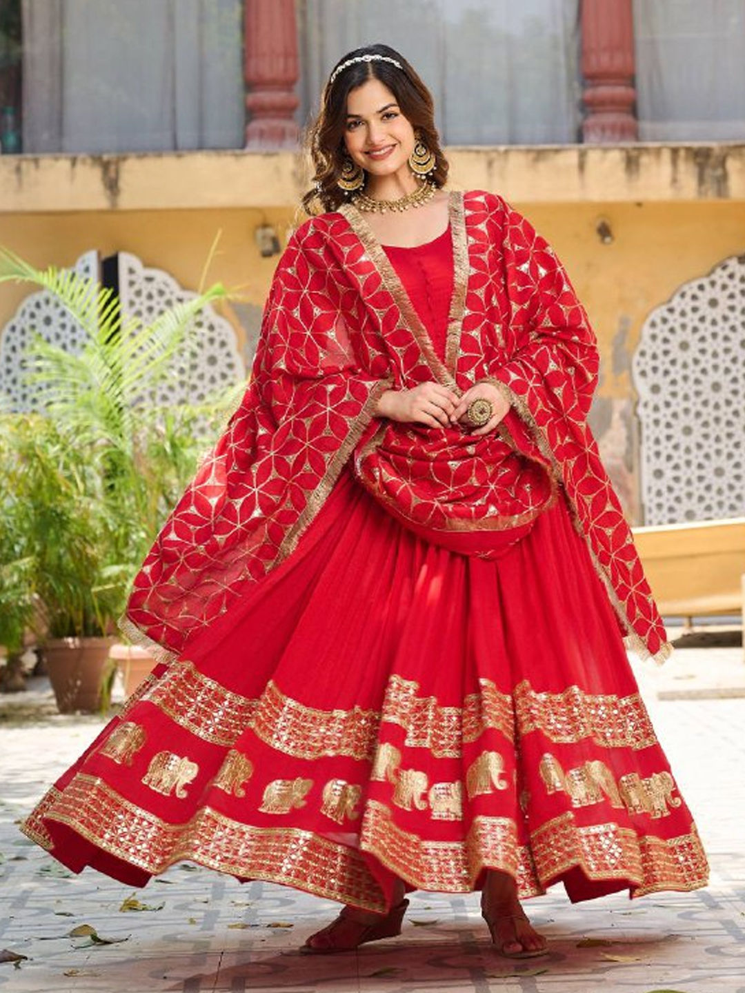Red and Maroon color Gown in Art Silk fabric with Embroidered, Sequence work