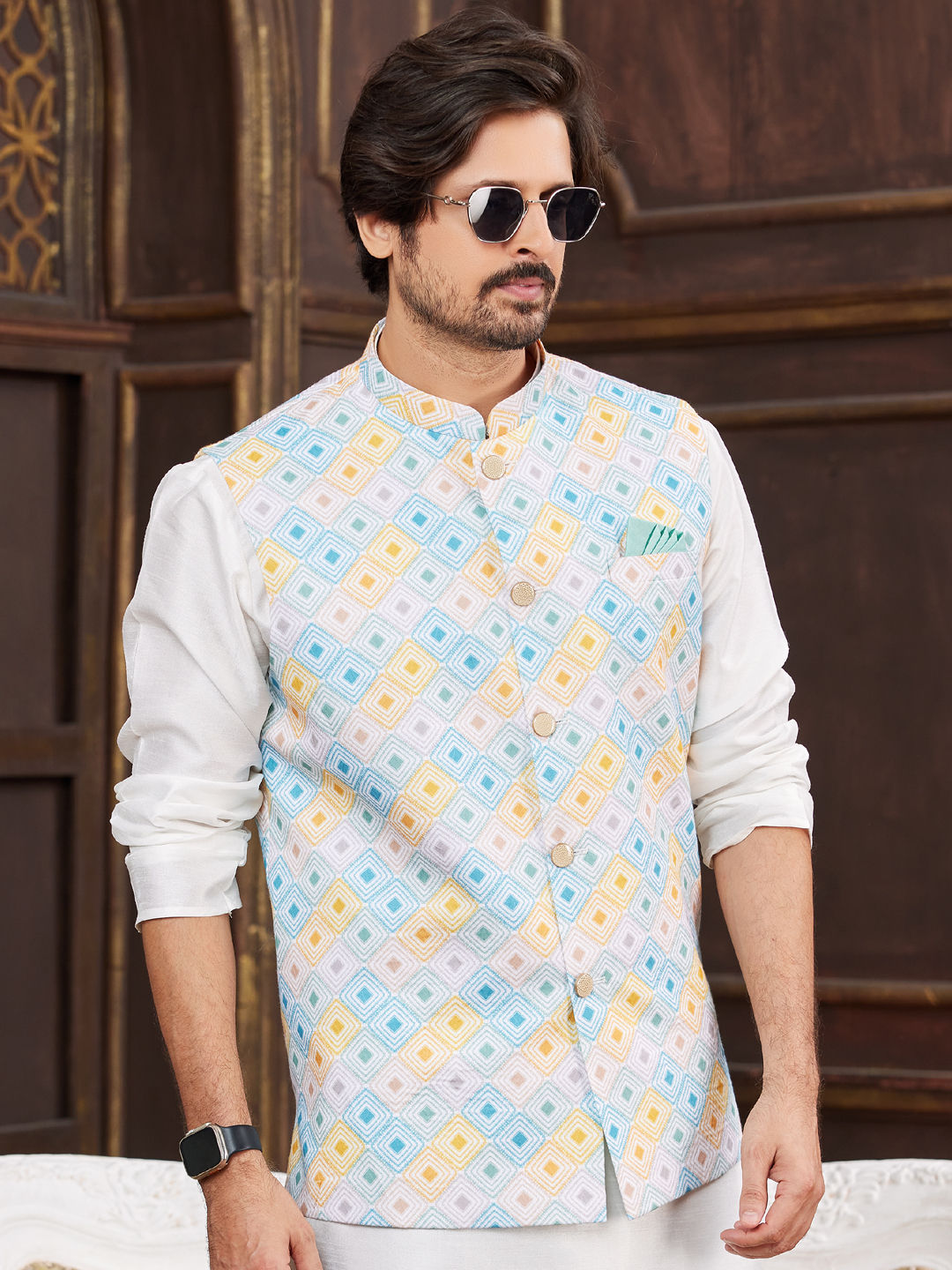 Art Silk Party Wear Nehru Jacket in Multicolor with Digital Print work