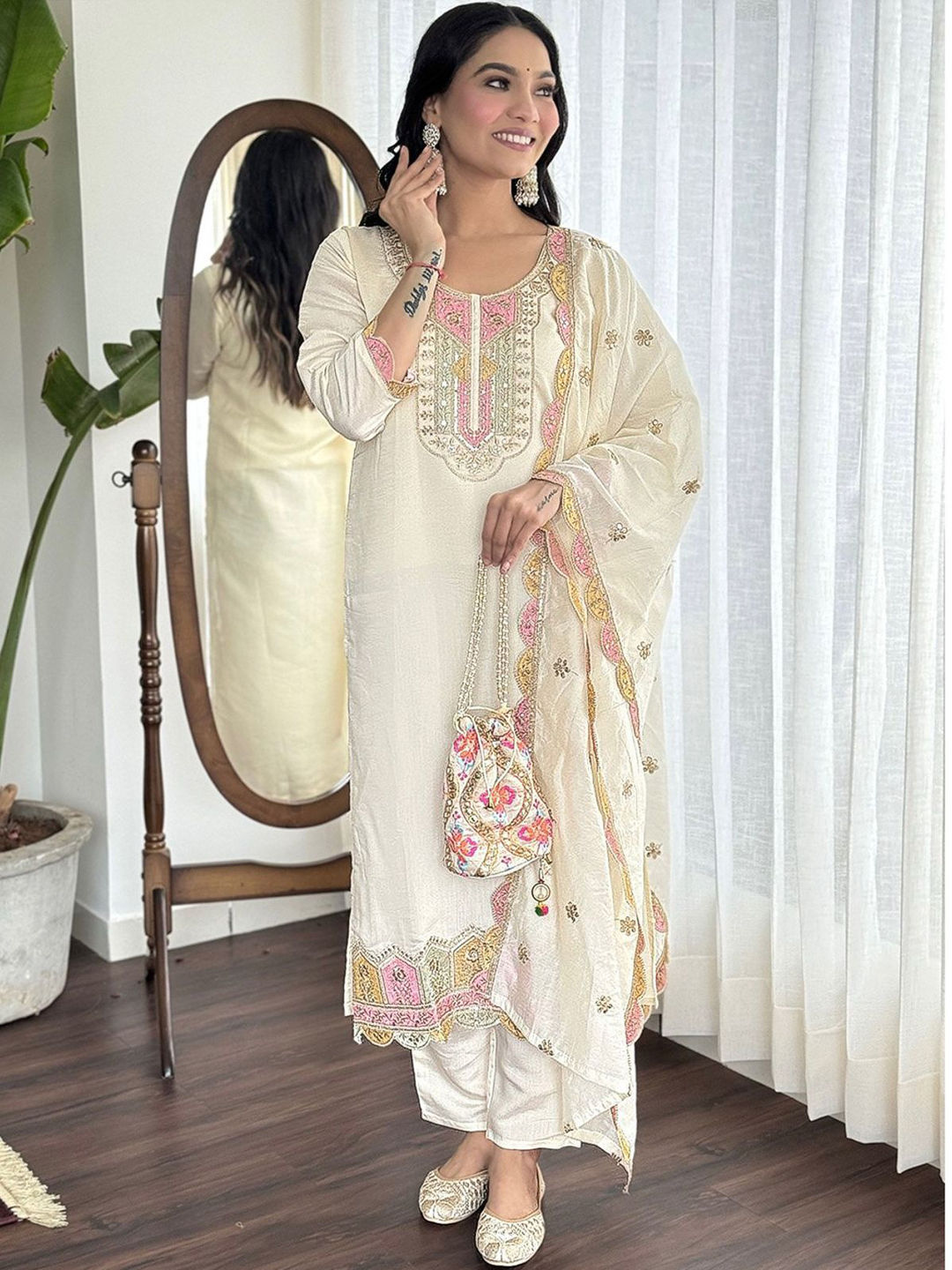 White and Off White color Salwar Kameez in Art Silk fabric with Embroidered, Resham, Thread work