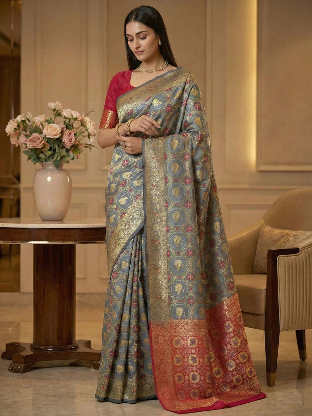Art Silk Traditional Saree in Black and Grey with Weaving work