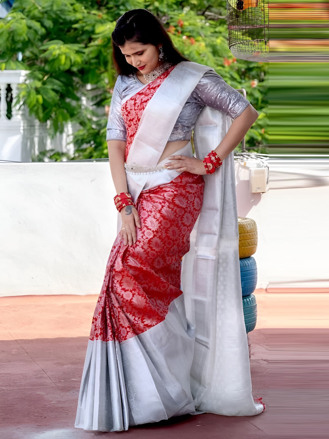 in Red and Maroon with Weaving work