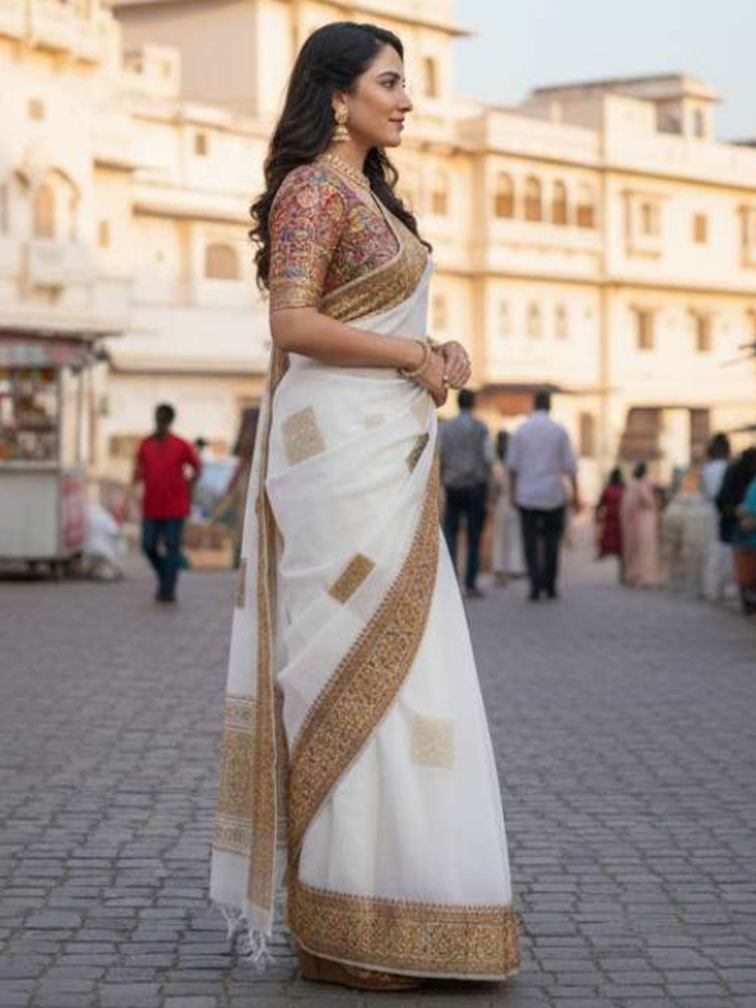 White and Off White color Saree in Art Silk fabric with Weaving, Zari work