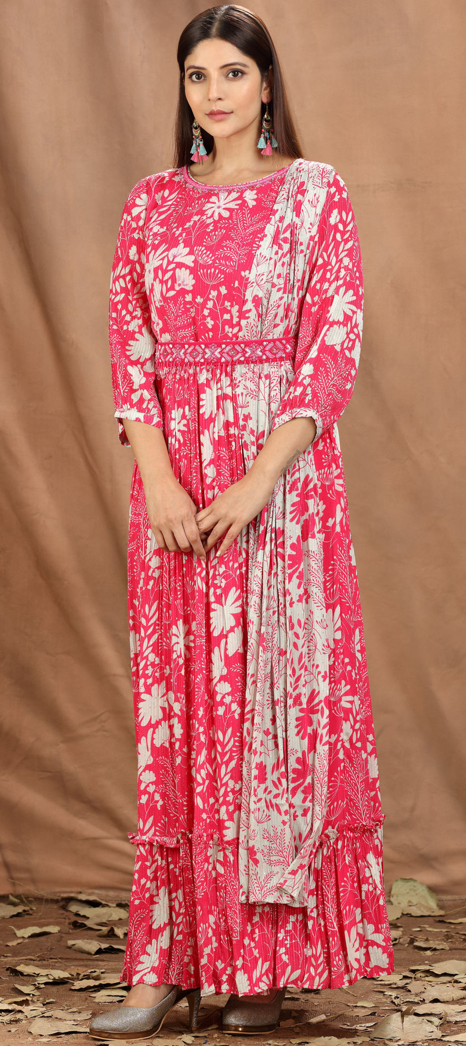Pink and Majenta color Gown in Art Silk fabric with Printed, Sequence work