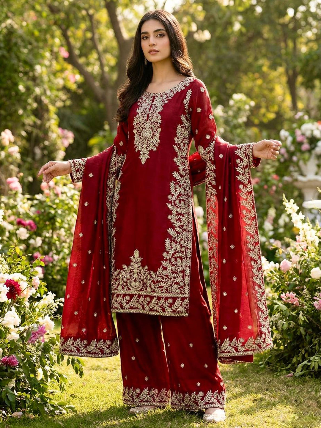 Red and Maroon color Salwar Kameez in Art Silk fabric with Embroidered, Sequence work