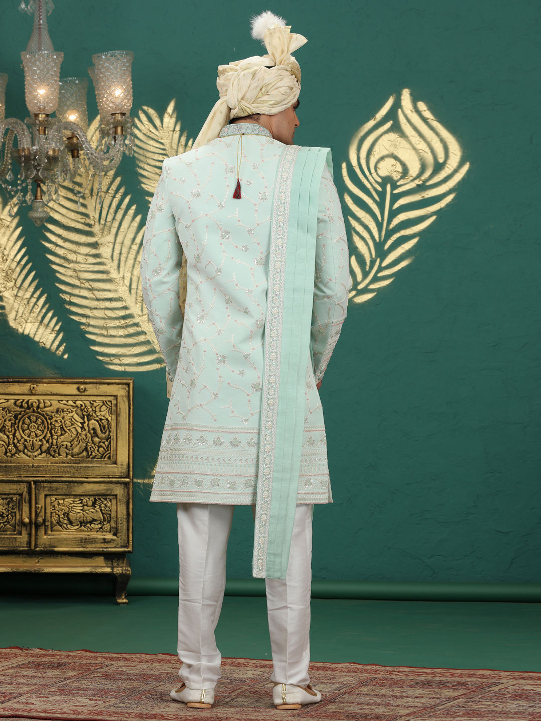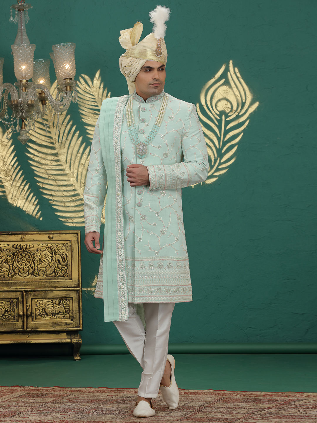 Green color Sherwani in Art Silk fabric with Embroidered work