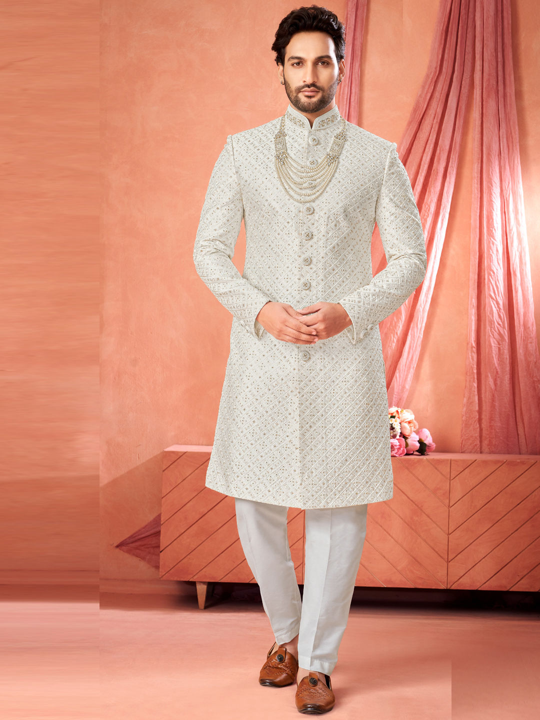 White and Off White color Sherwani in Art Silk fabric with Embroidered work