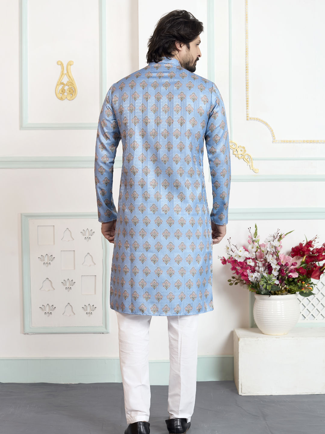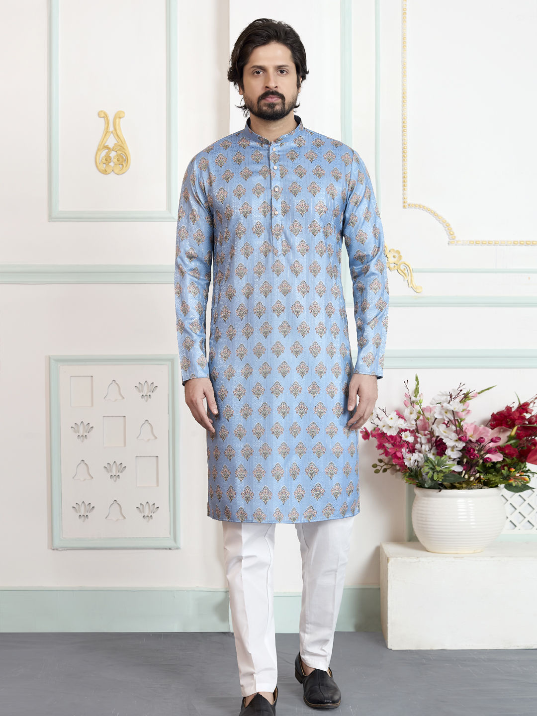 Art Silk Festive Kurta Pyjamas in Blue with Digital Print work