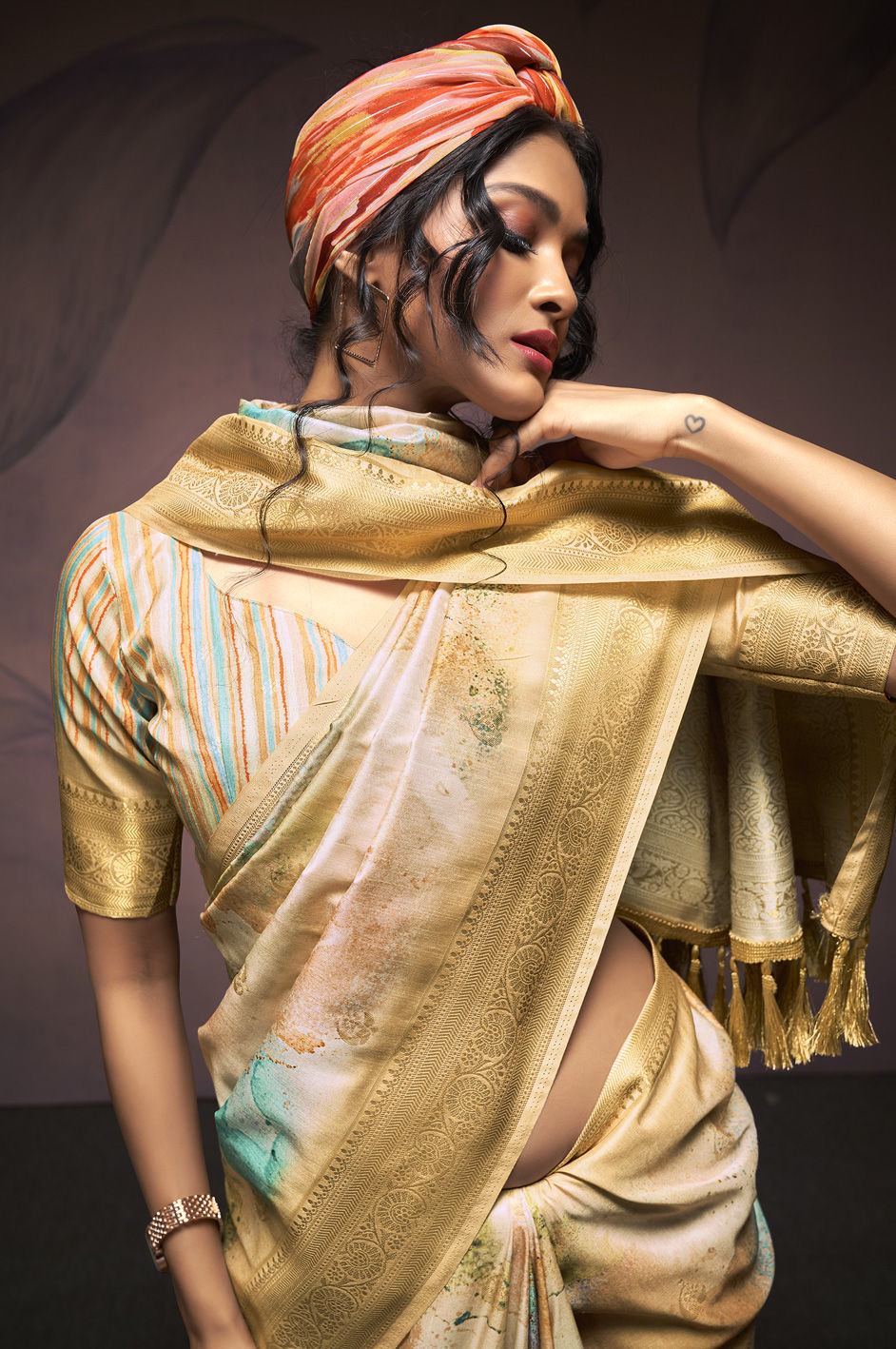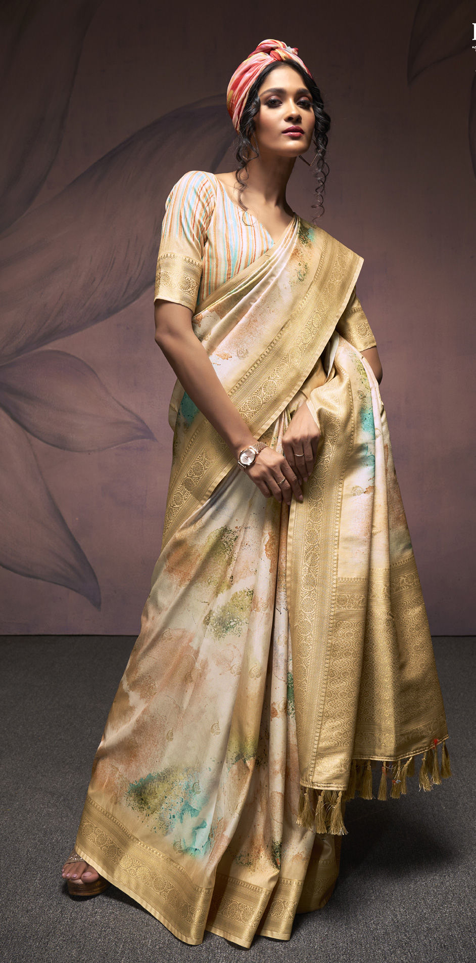 Beige and Brown color Saree in Art Silk fabric with Digital Print, Weaving work