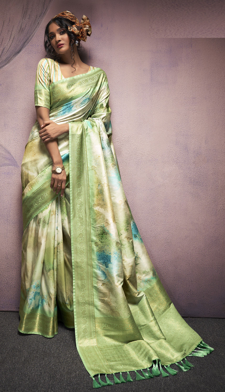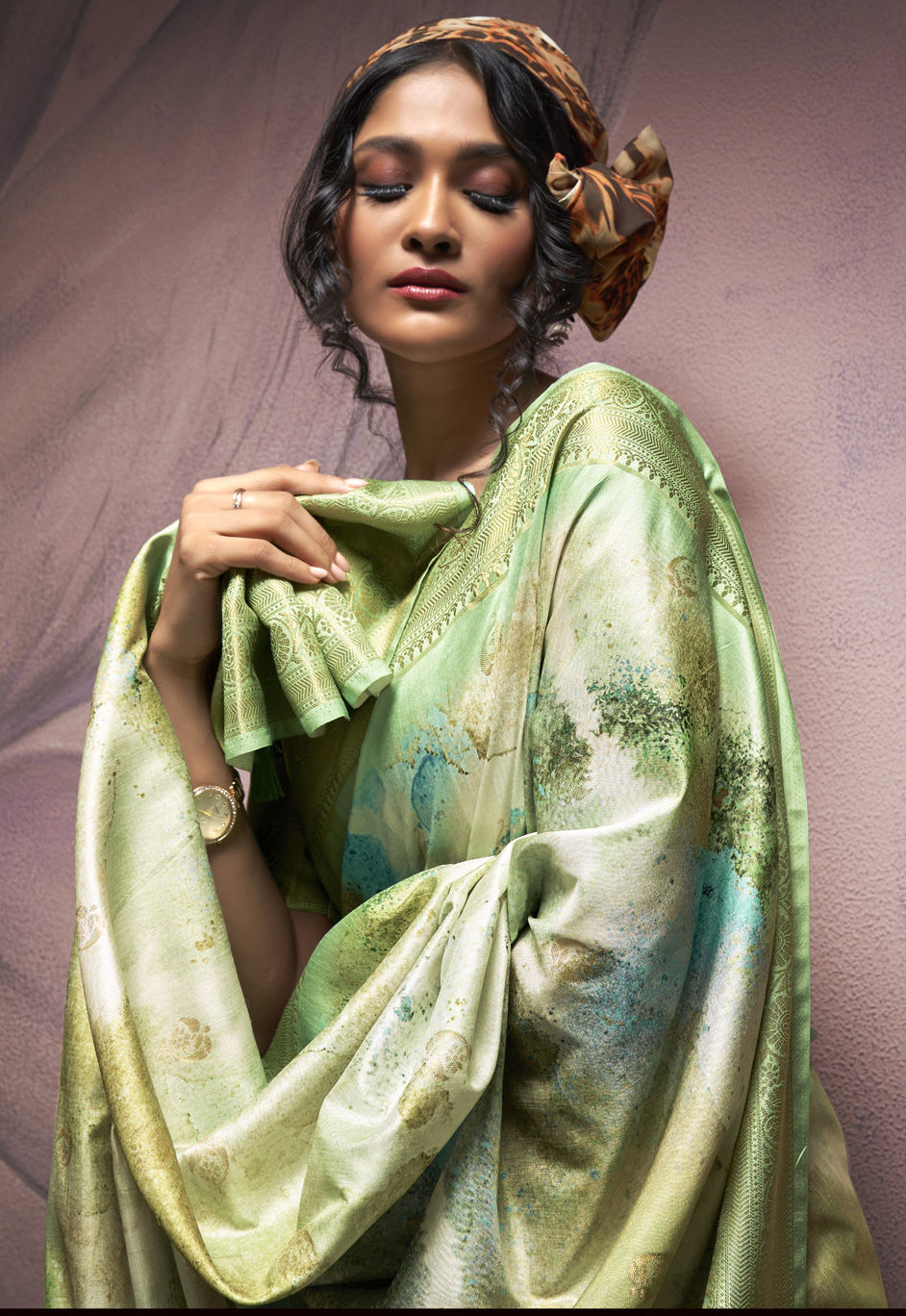 Green color Saree in Art Silk fabric with Digital Print, Weaving work