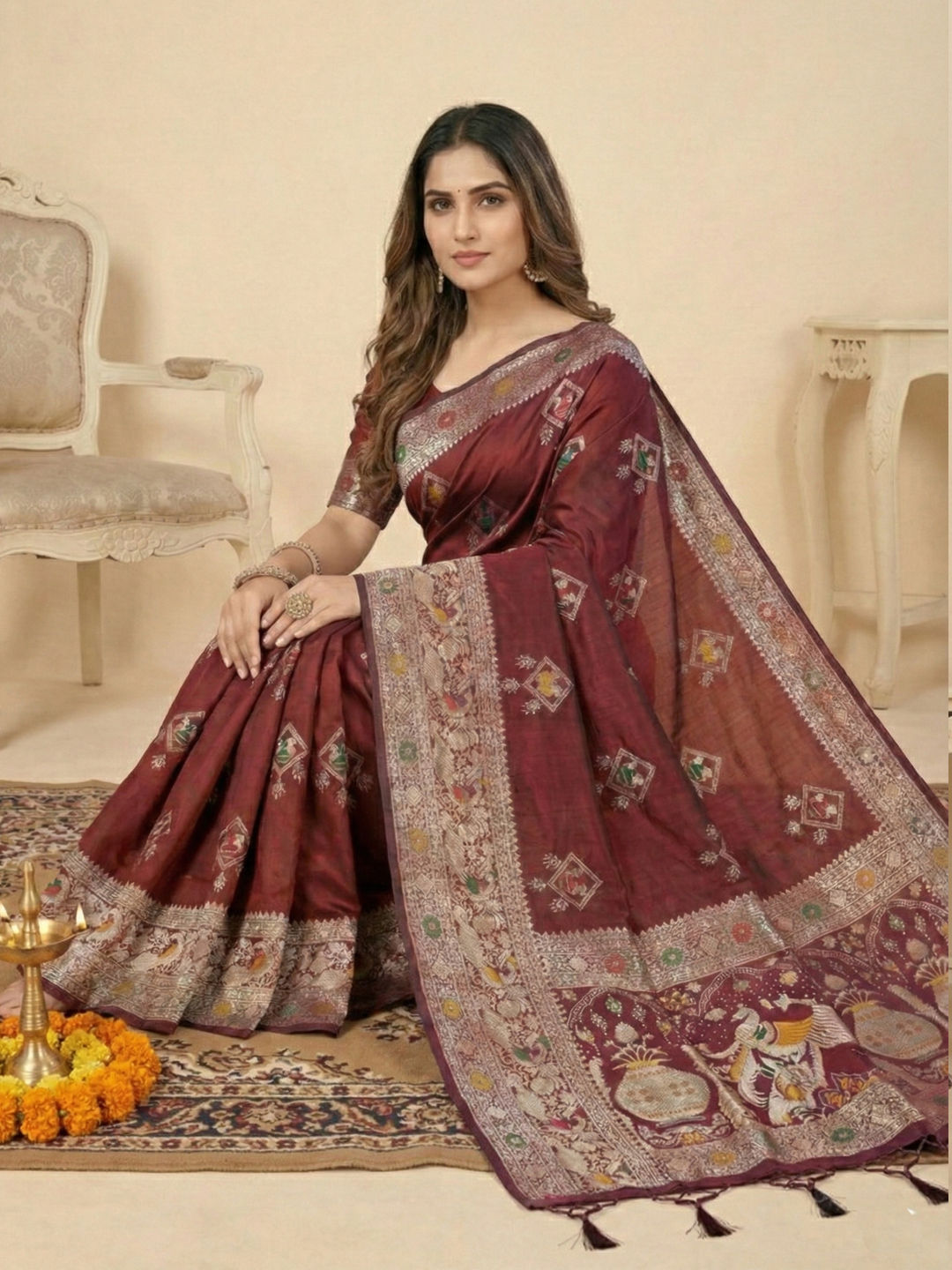 Art Silk Festive Saree in Red and Maroon with Weaving work
