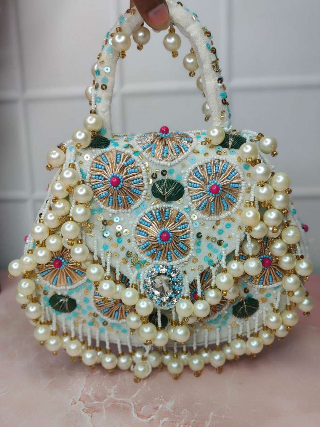Art Silk Wedding Clutches in White and Off White with Moti work