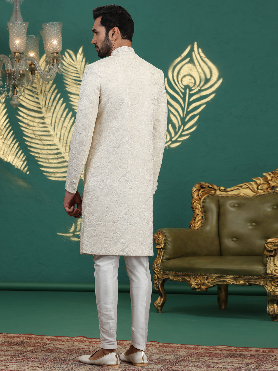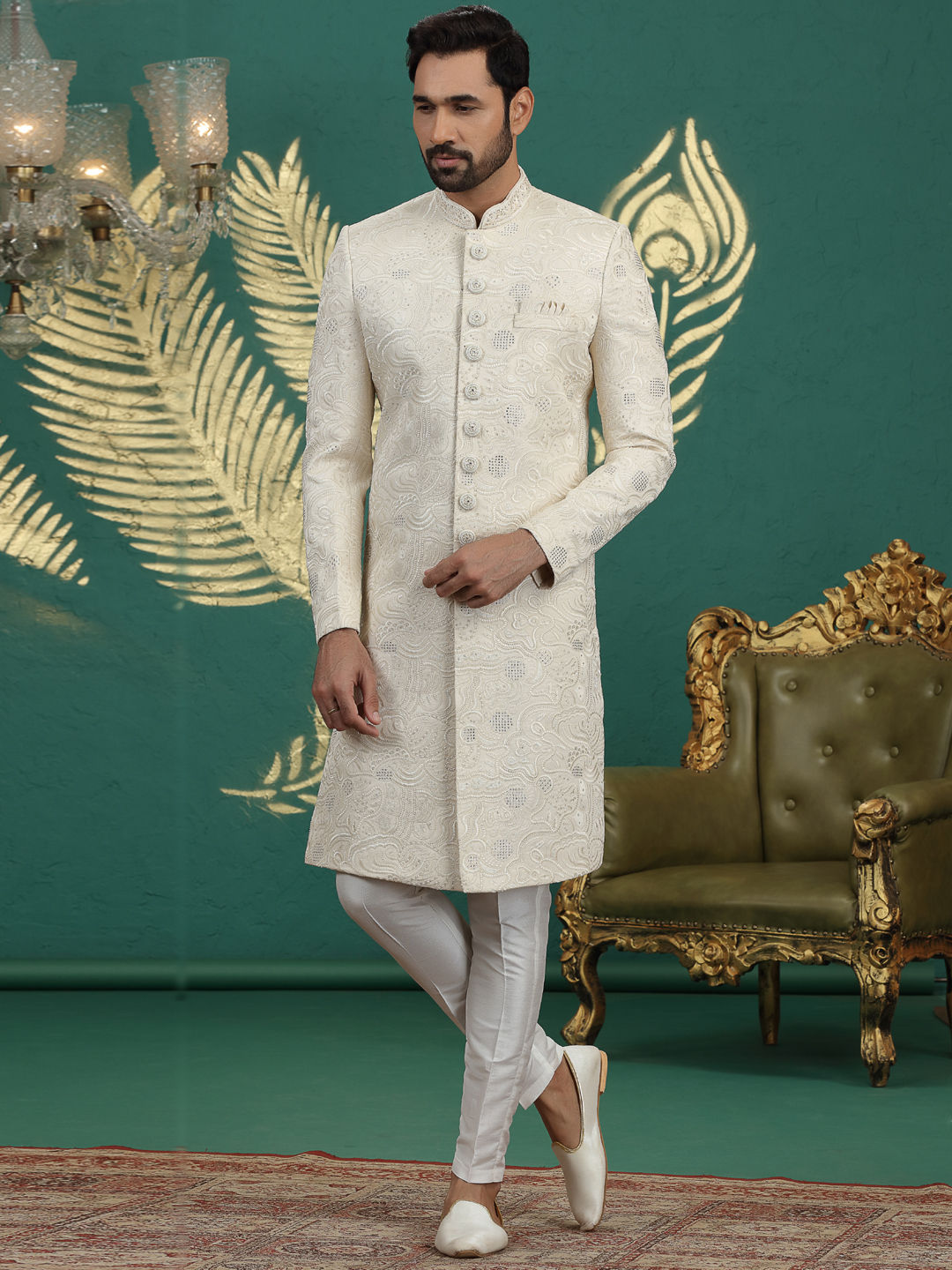 Beige and Brown color Sherwani in Art Silk fabric with Embroidered work