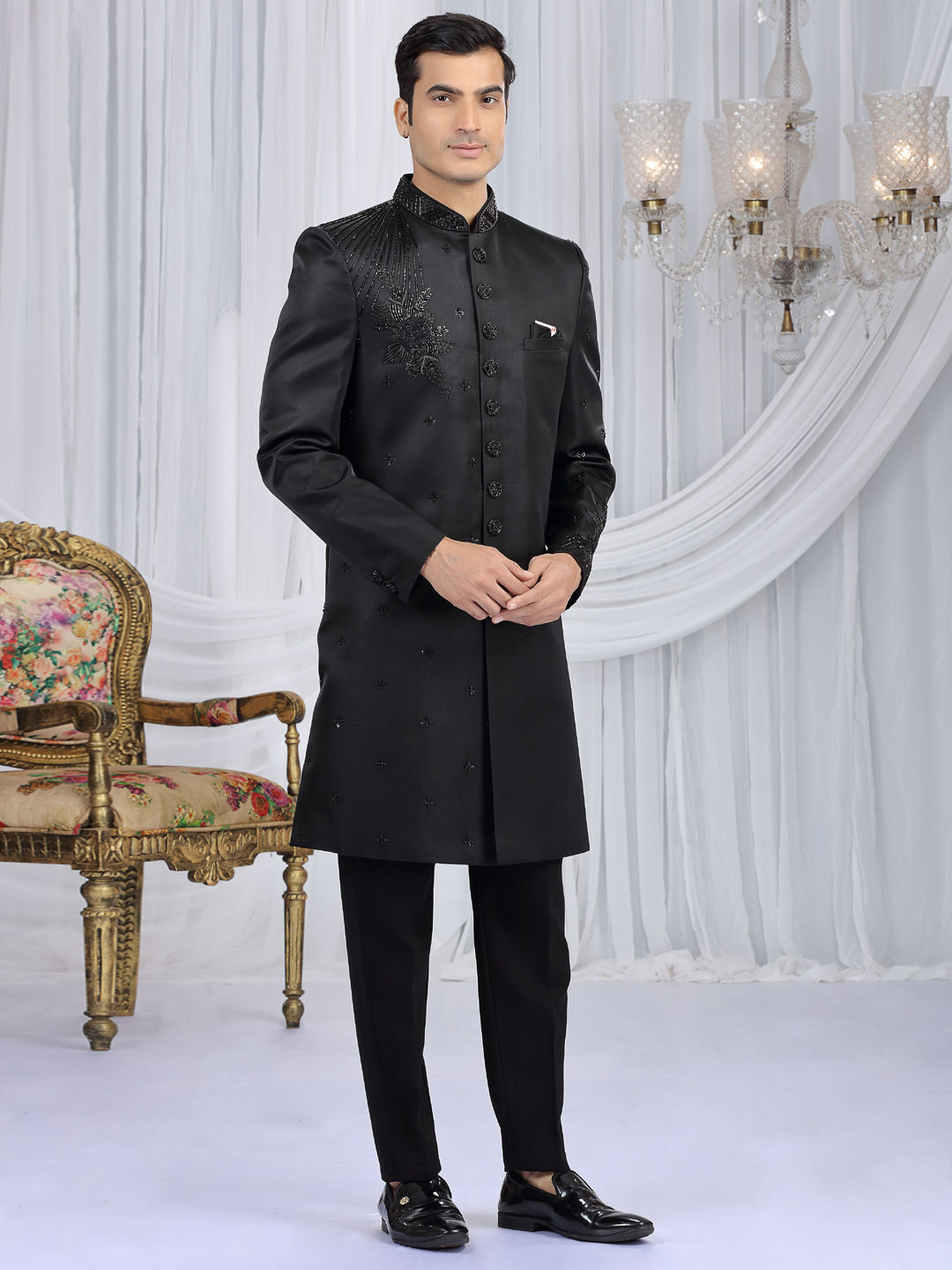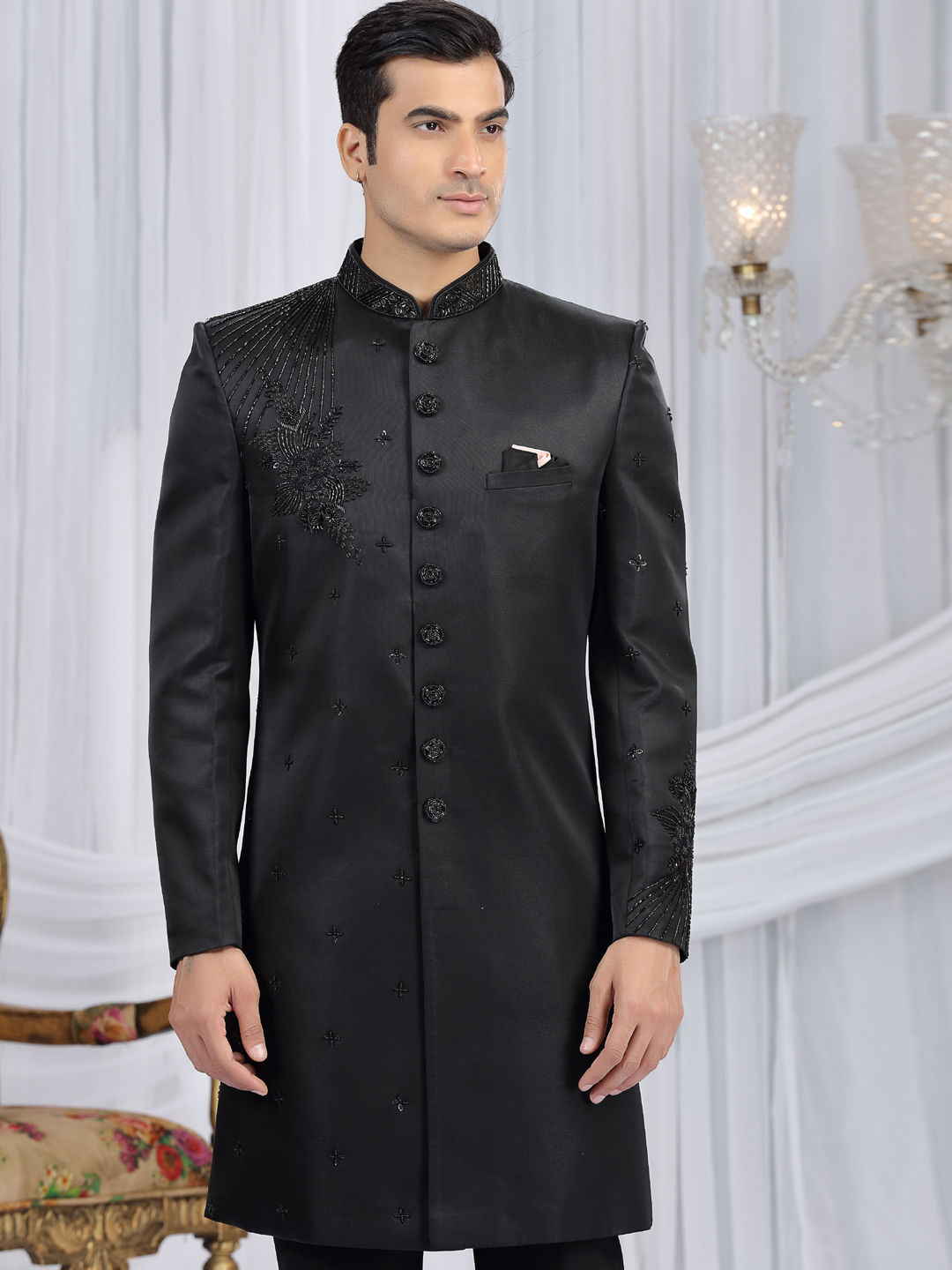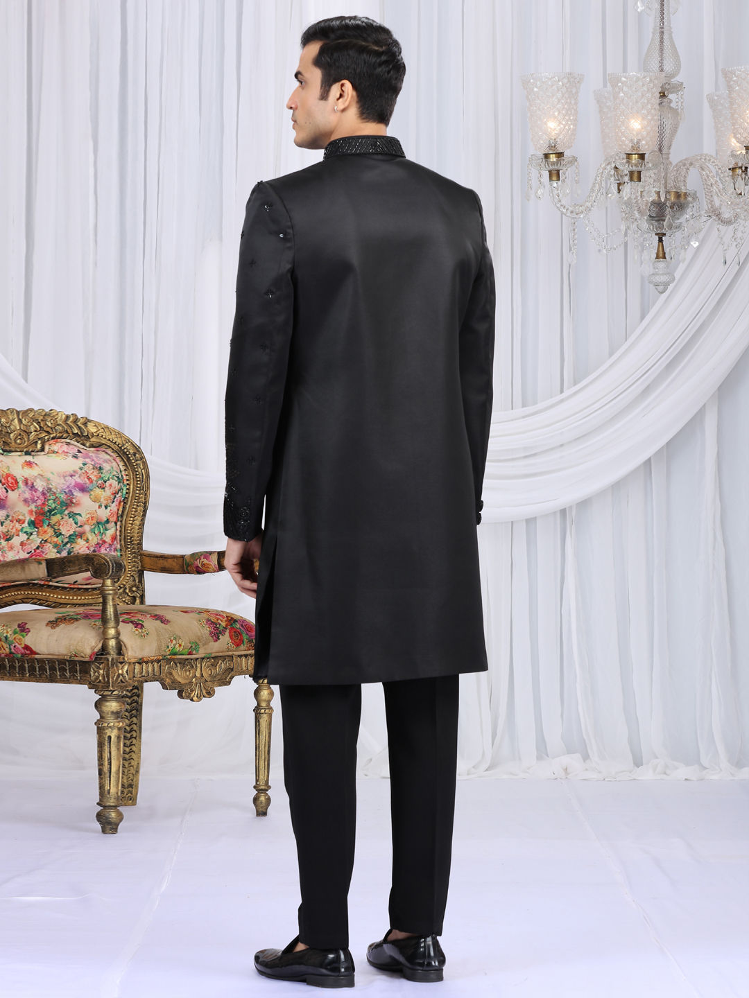 Velvet Reception Sherwani in Black and Grey with Cut Dana work