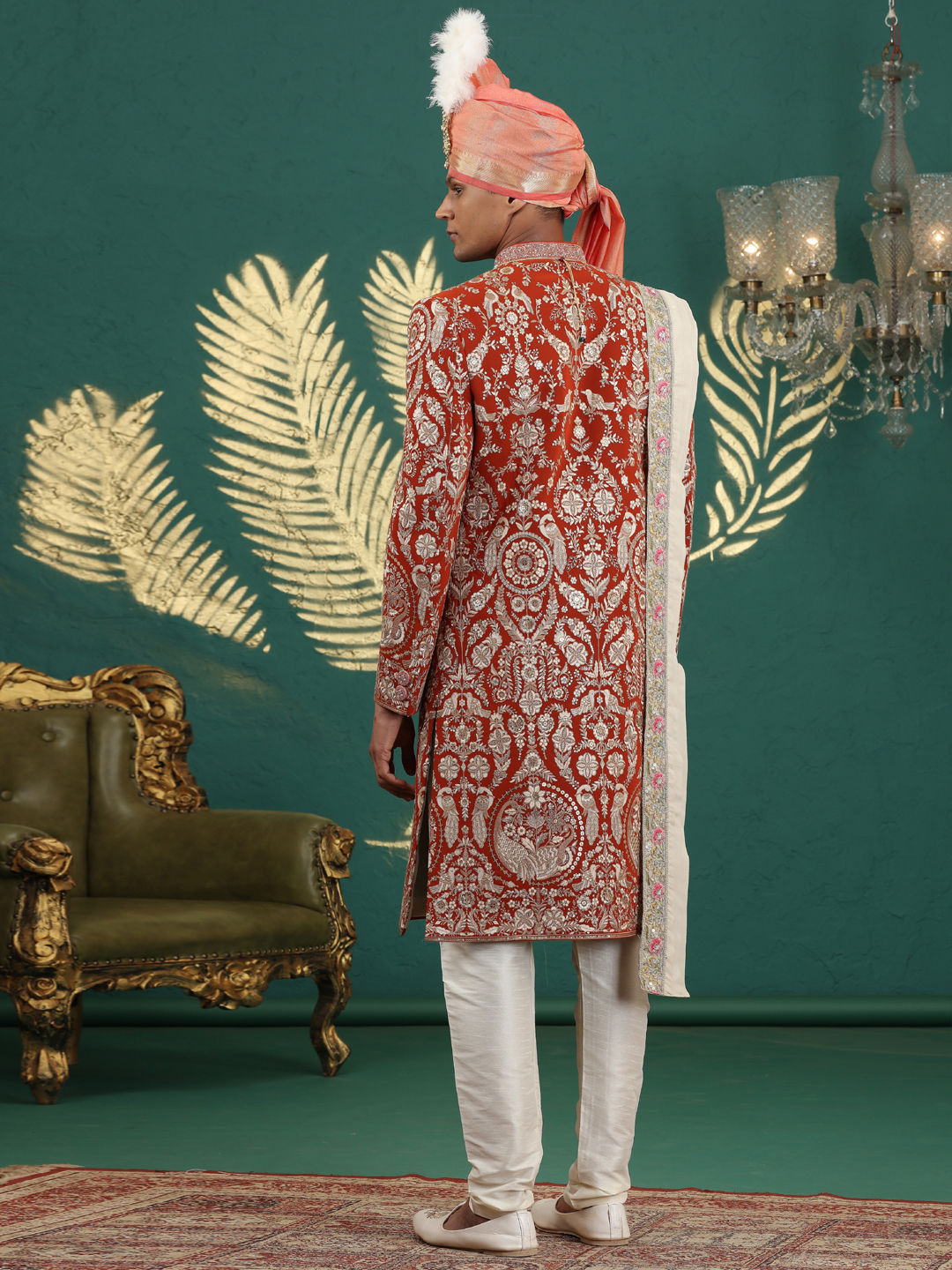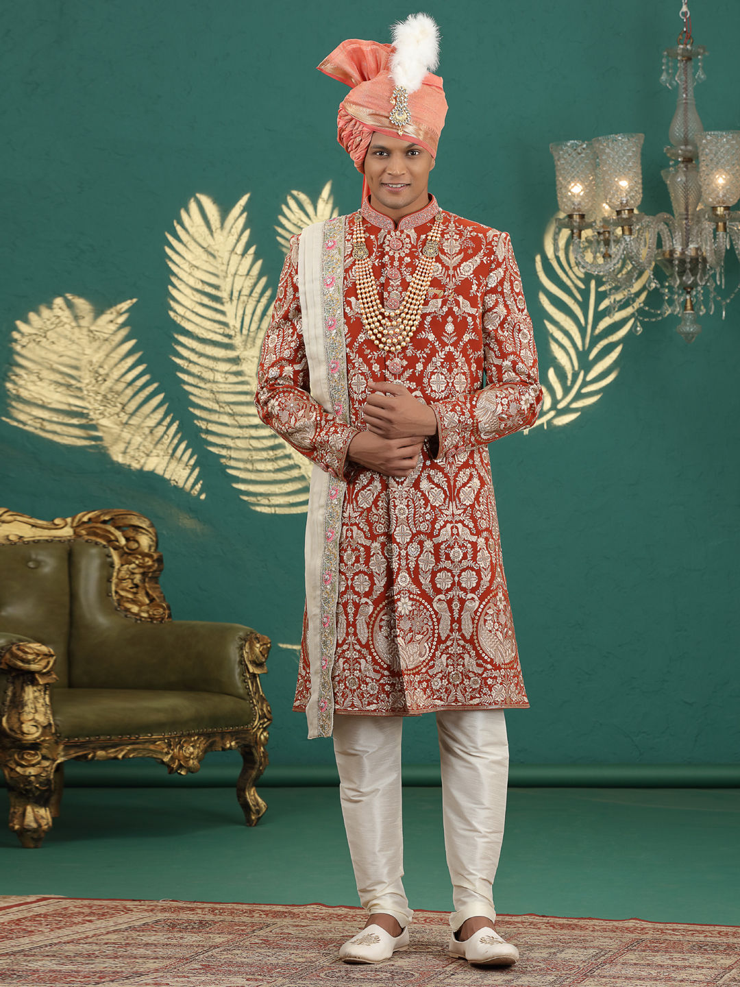 Orange color Sherwani in Art Silk fabric with Embroidered work