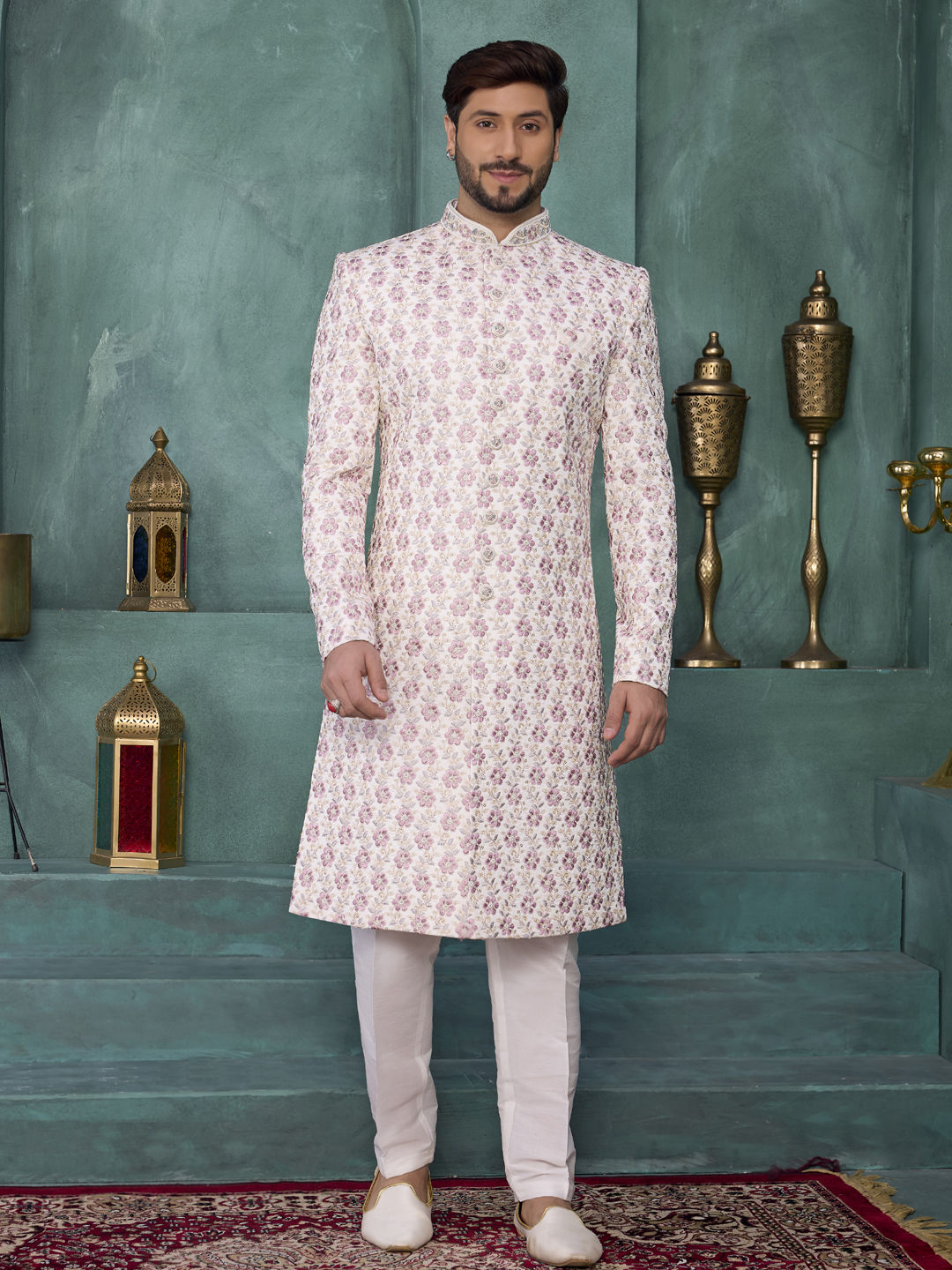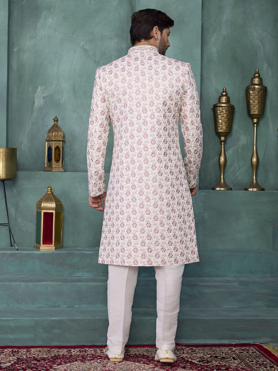 White and Off White color Sherwani in Art Silk fabric with Embroidered, Thread work