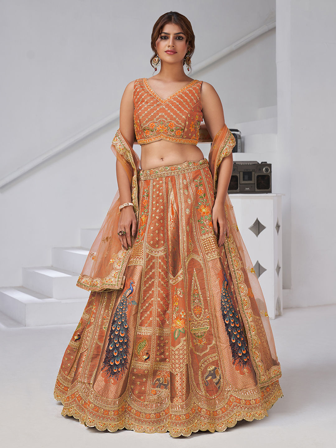 Silk Wedding Lehenga in Beige and Brown with Thread work