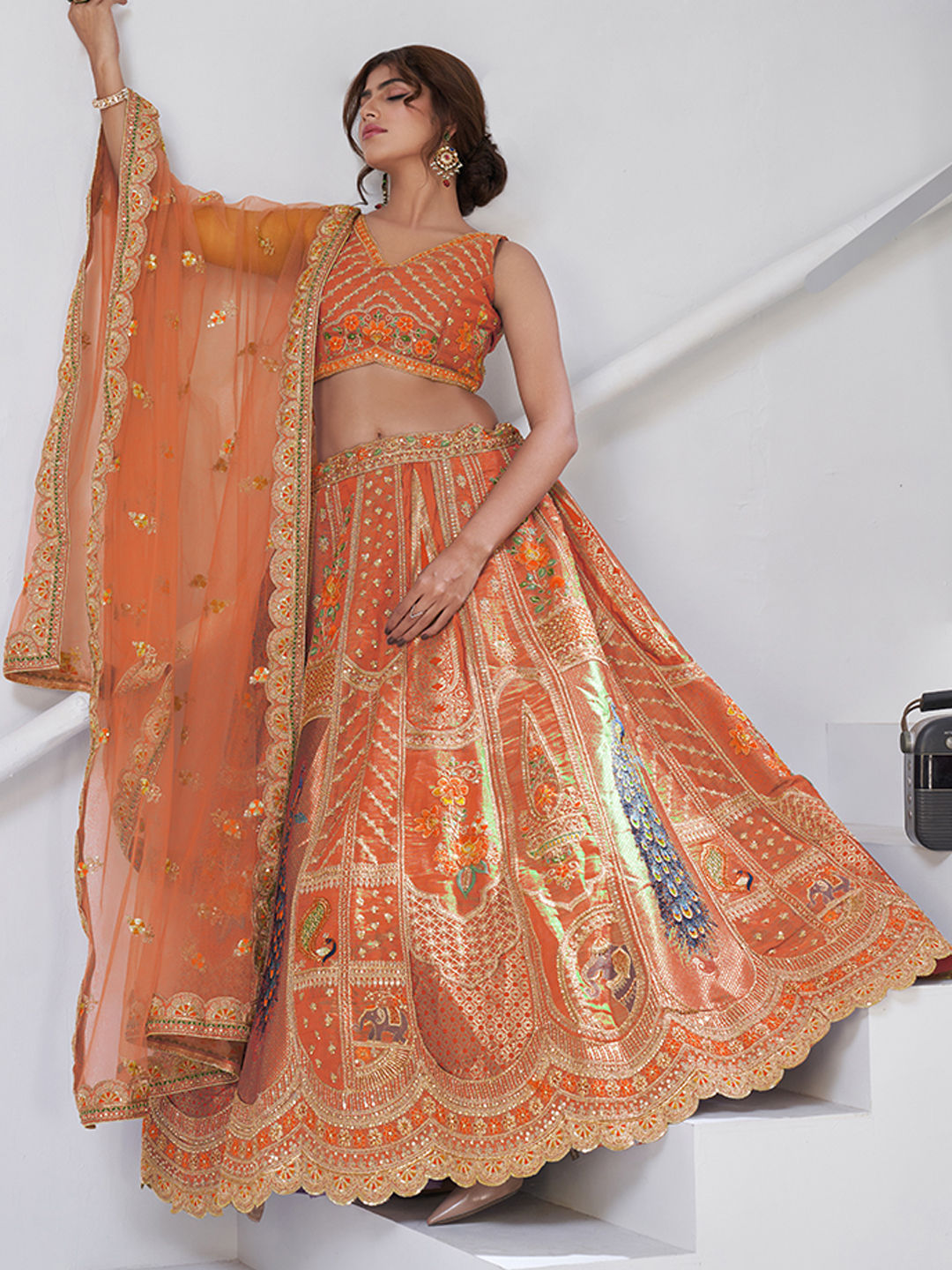 Beige and Brown color Lehenga in Banarasi Silk fabric with Embroidered, Sequence, Thread, Zari work