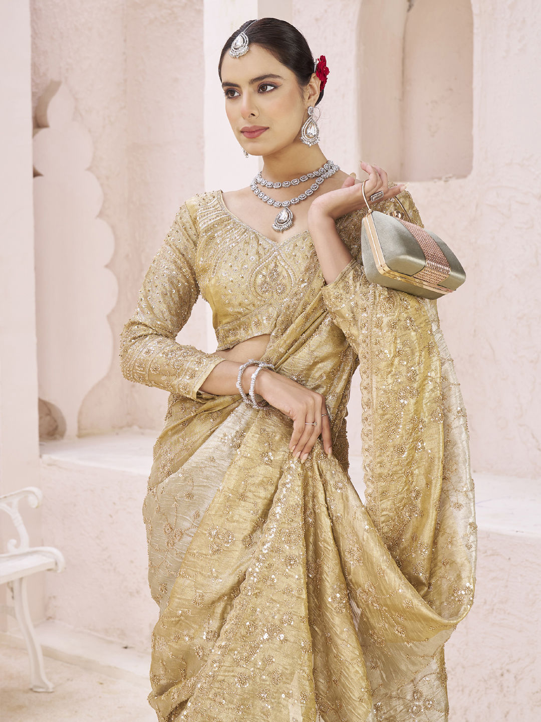 Gold color Saree in Banarasi Silk, Crushed Silk fabric with Bugle Beads, Embroidered, Moti, Sequence work