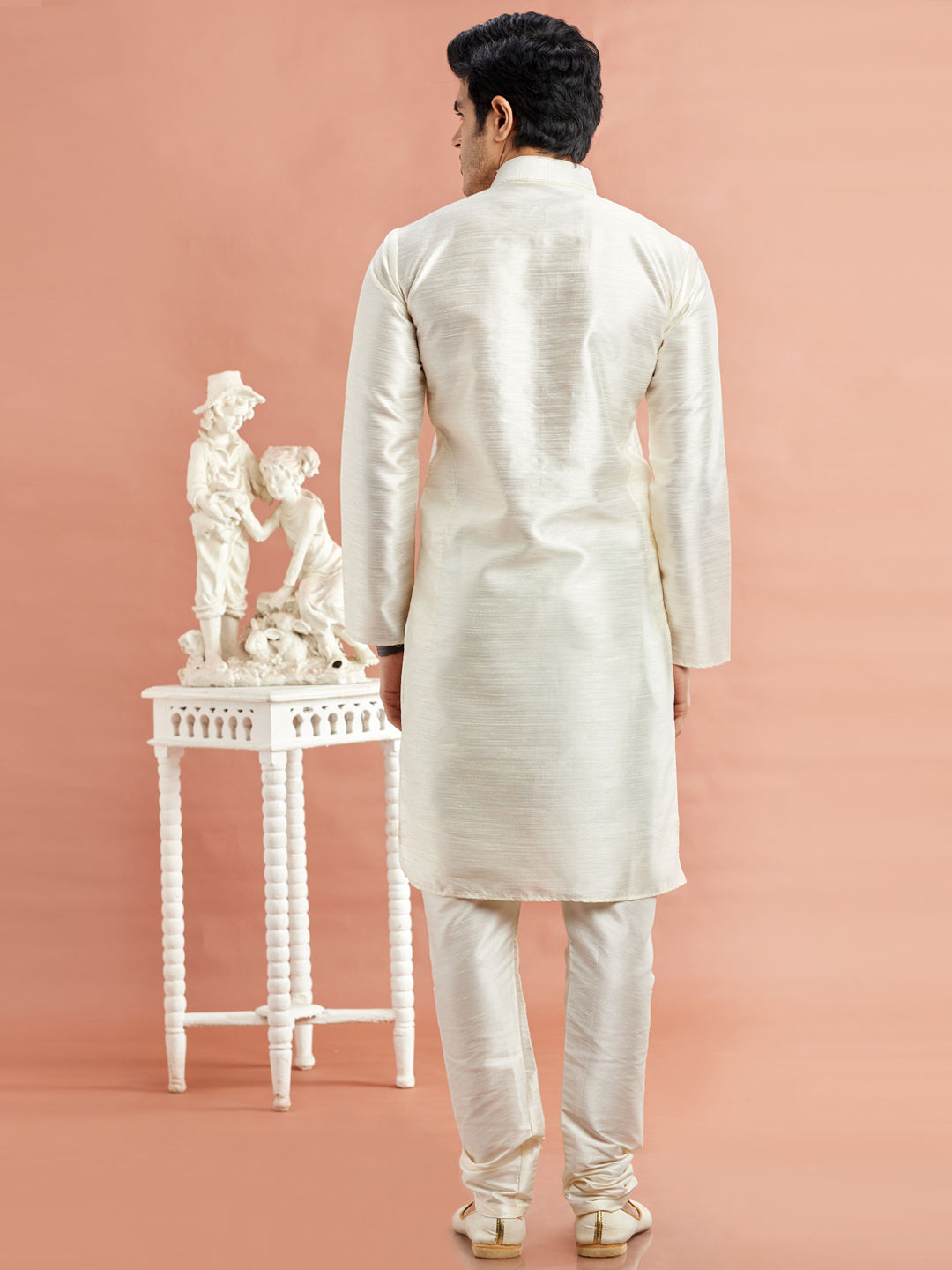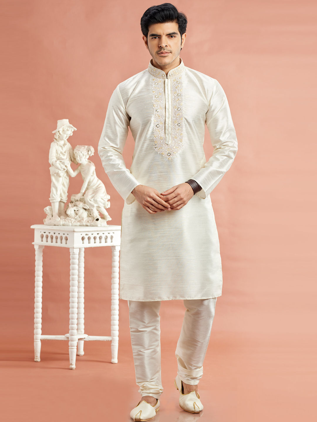 White and Off White color Kurta Pyjamas in Banarasi Silk fabric with Embroidered, Mirror work