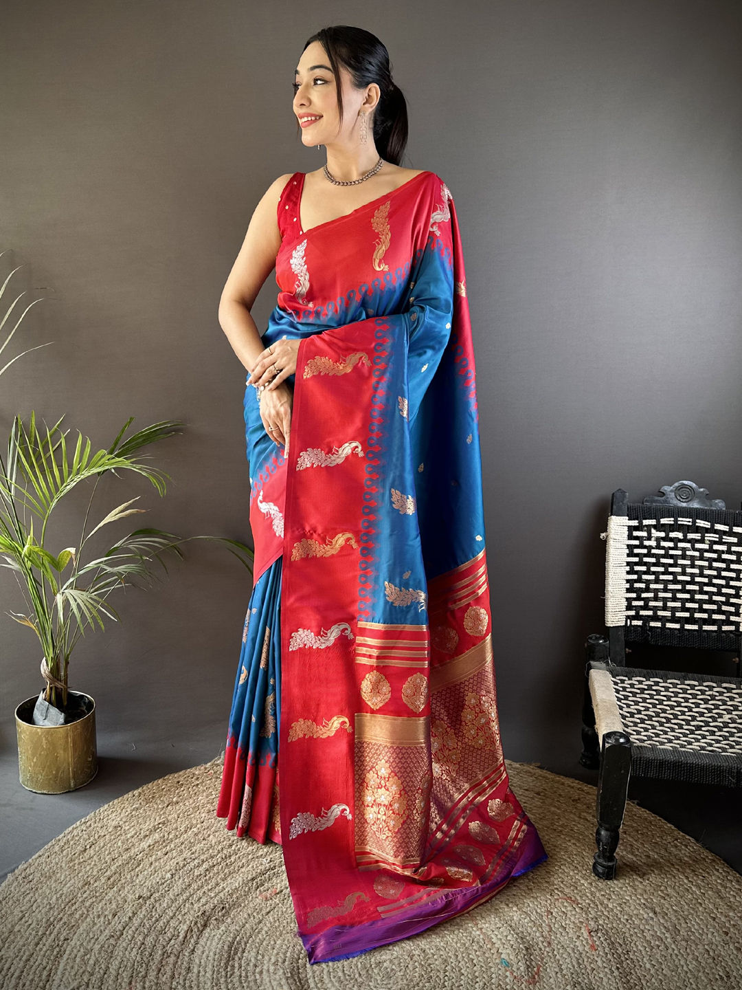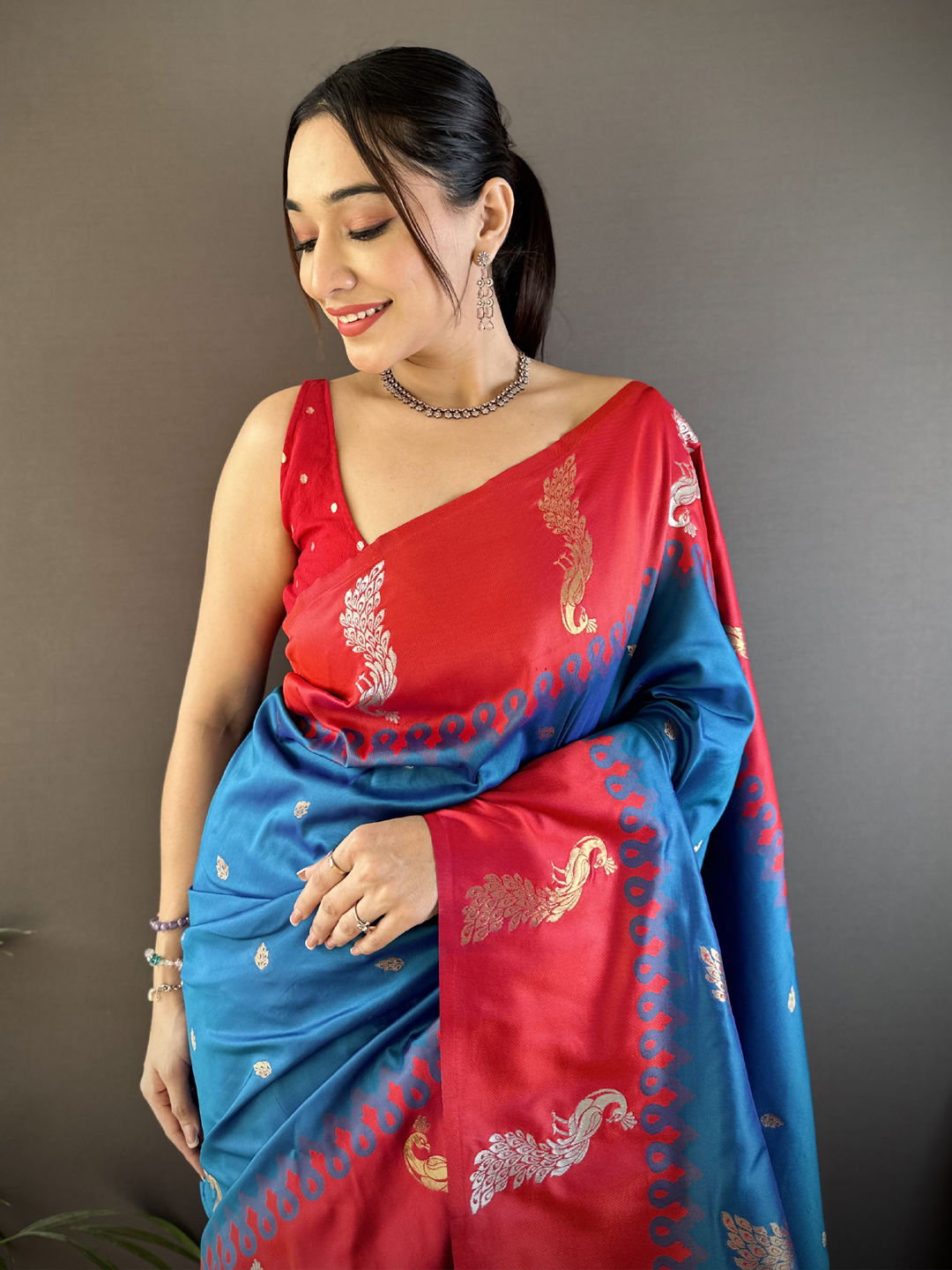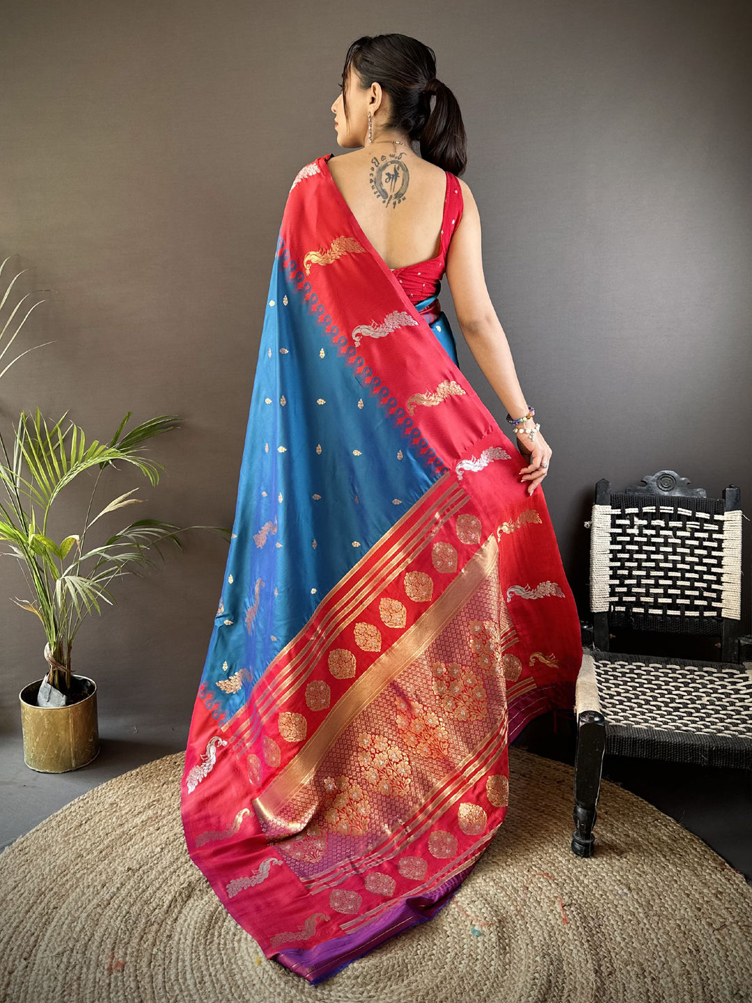 Blue, Red and Maroon color Saree in Banarasi Silk fabric with Weaving work