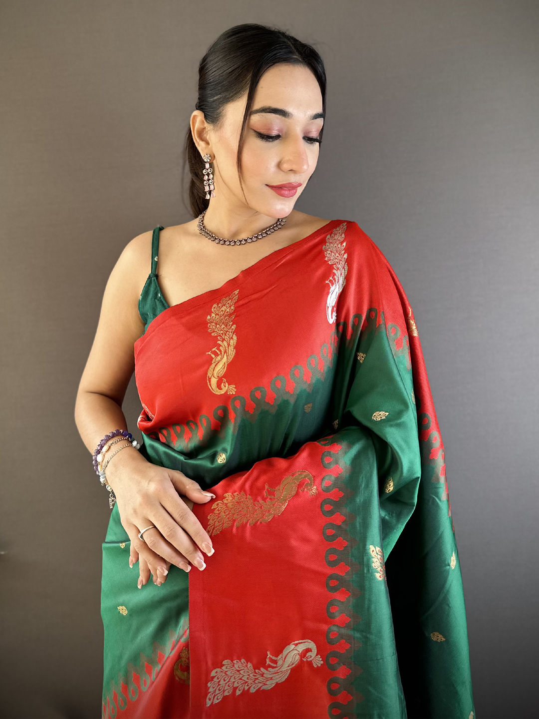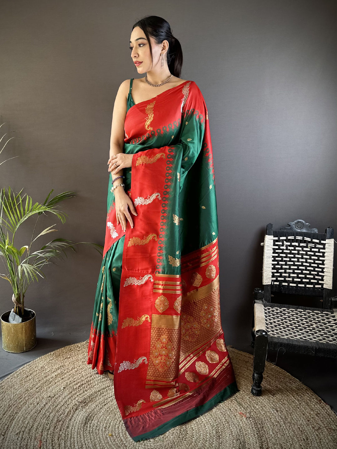 Green, Red and Maroon color Saree in Banarasi Silk fabric with Weaving work