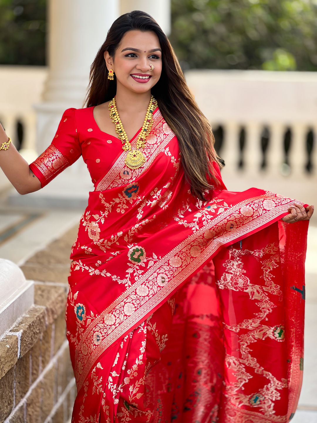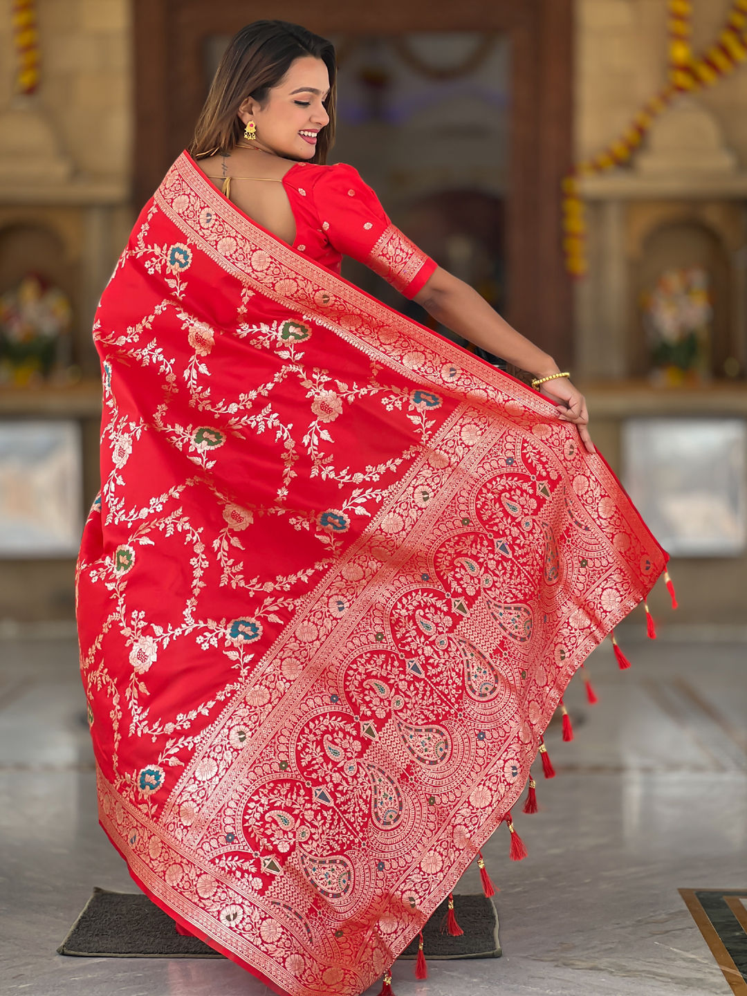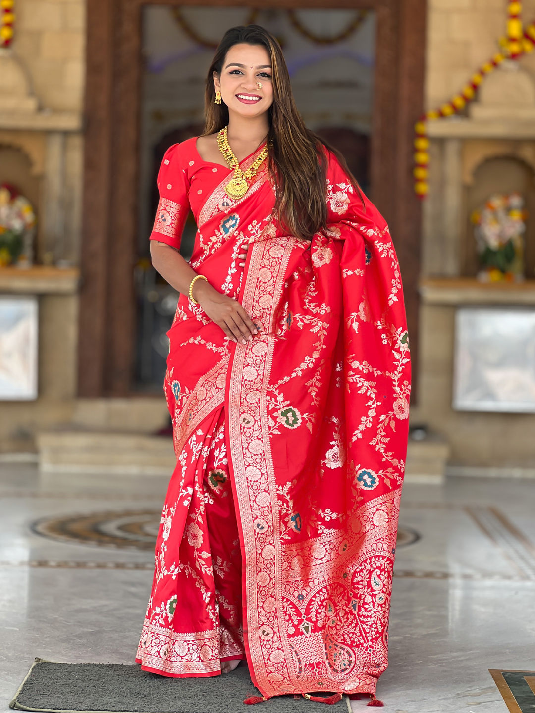 Red and Maroon color Saree in Banarasi Silk fabric with Weaving work
