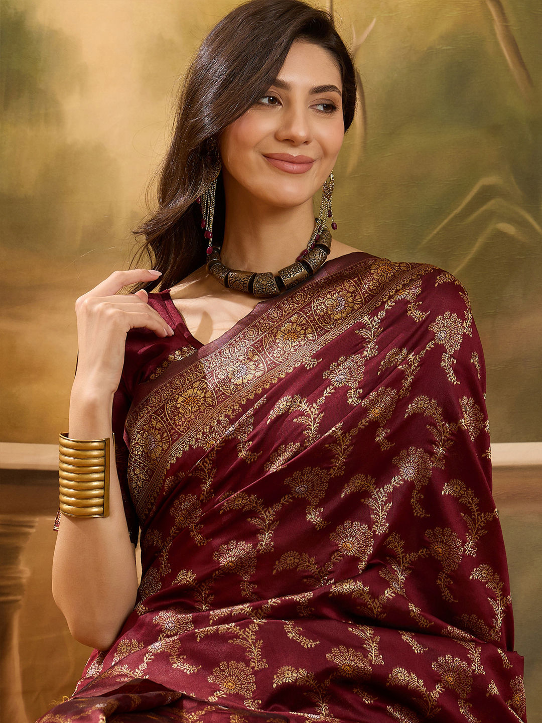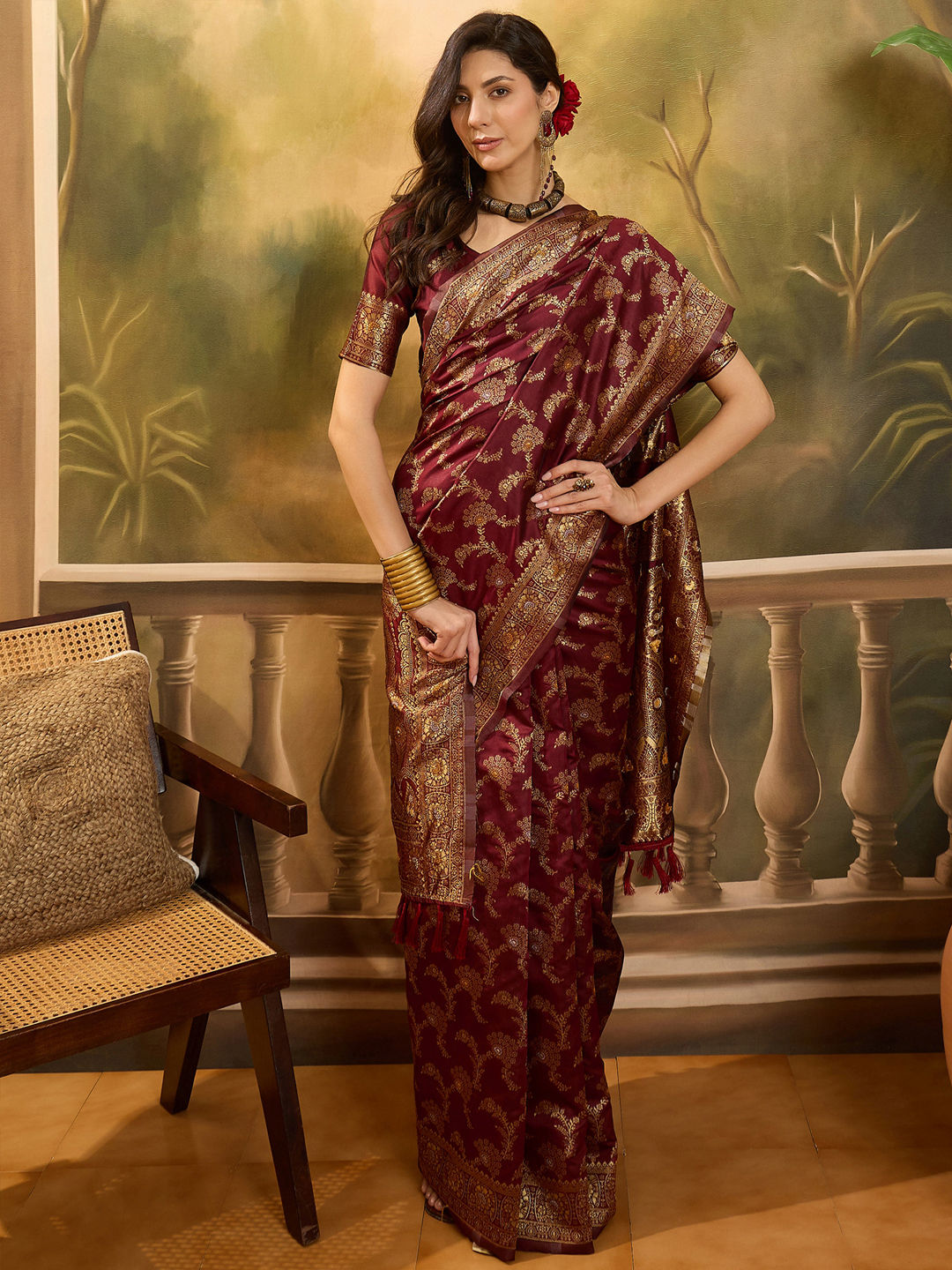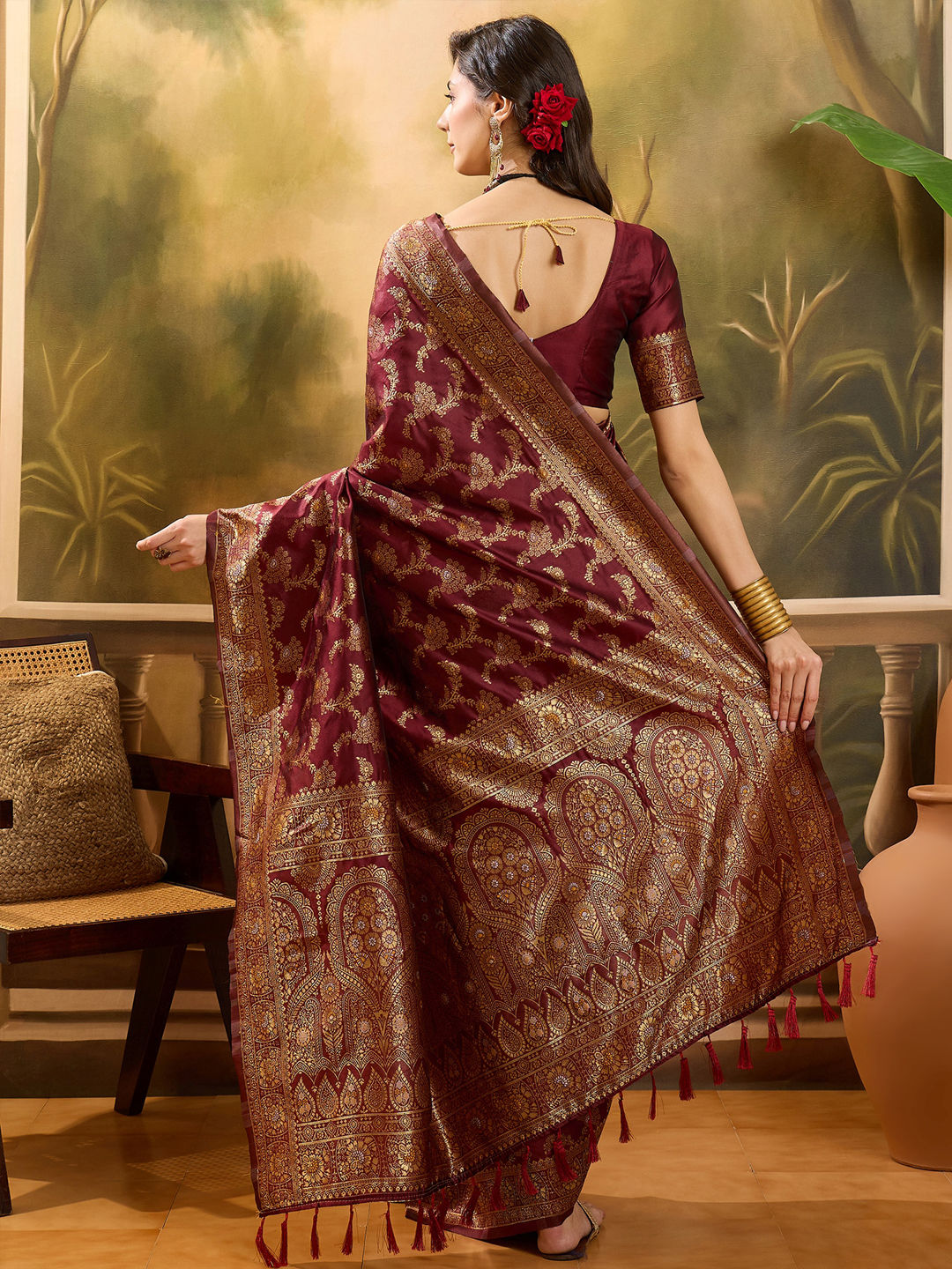 Red and Maroon color Saree in Banarasi Silk, Jacquard fabric with Weaving work