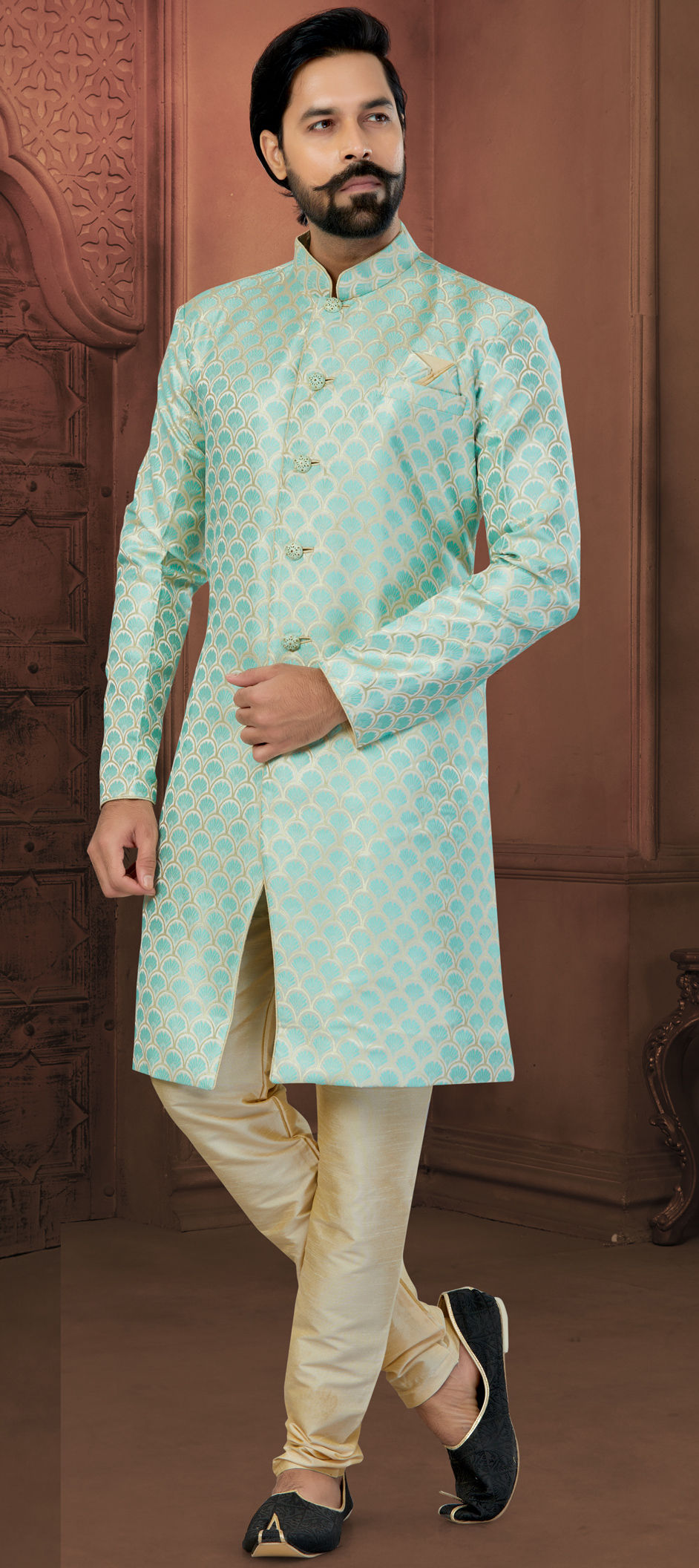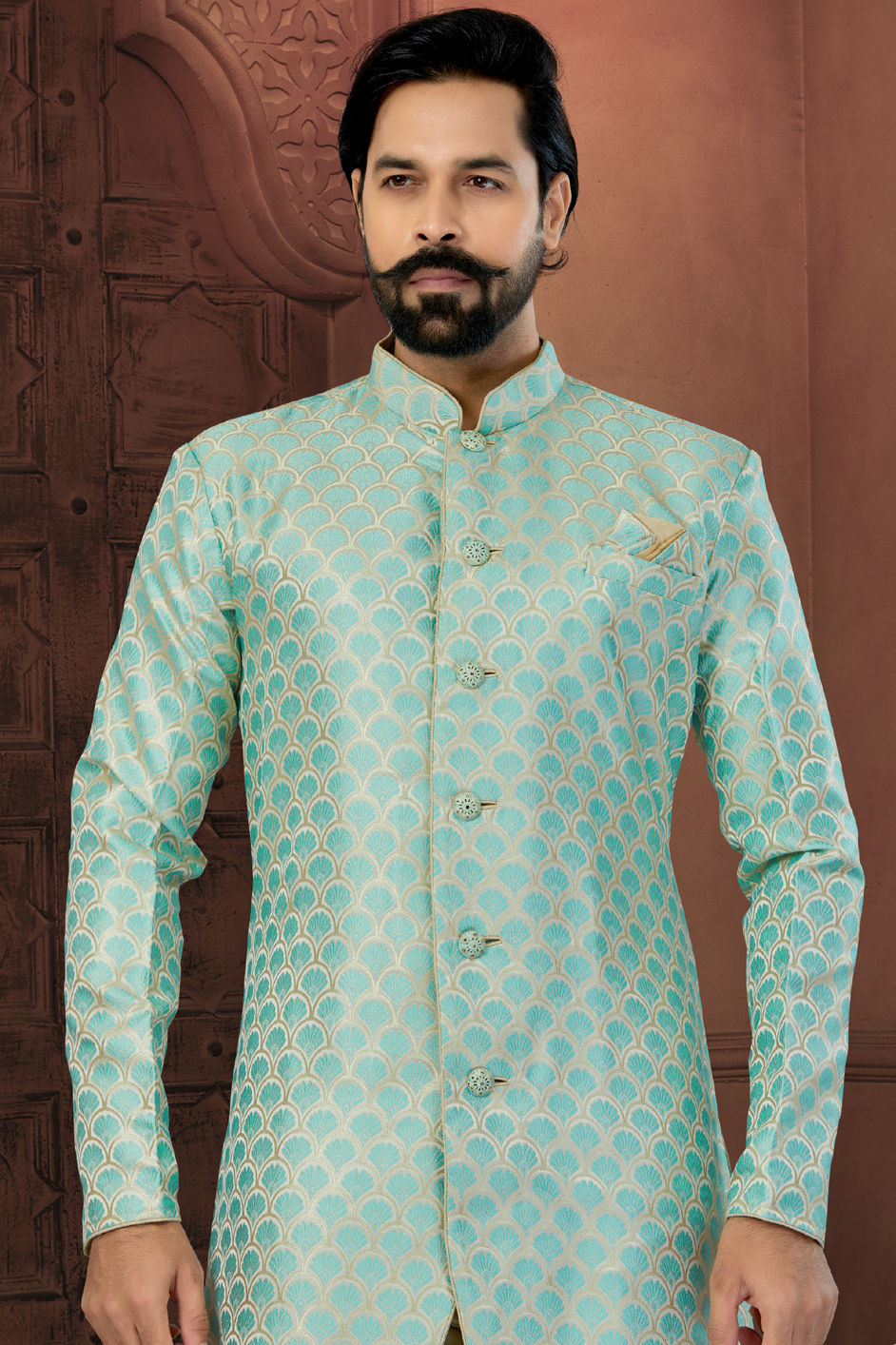 Jacquard Party Wear IndoWestern Dress in Blue with Thread work