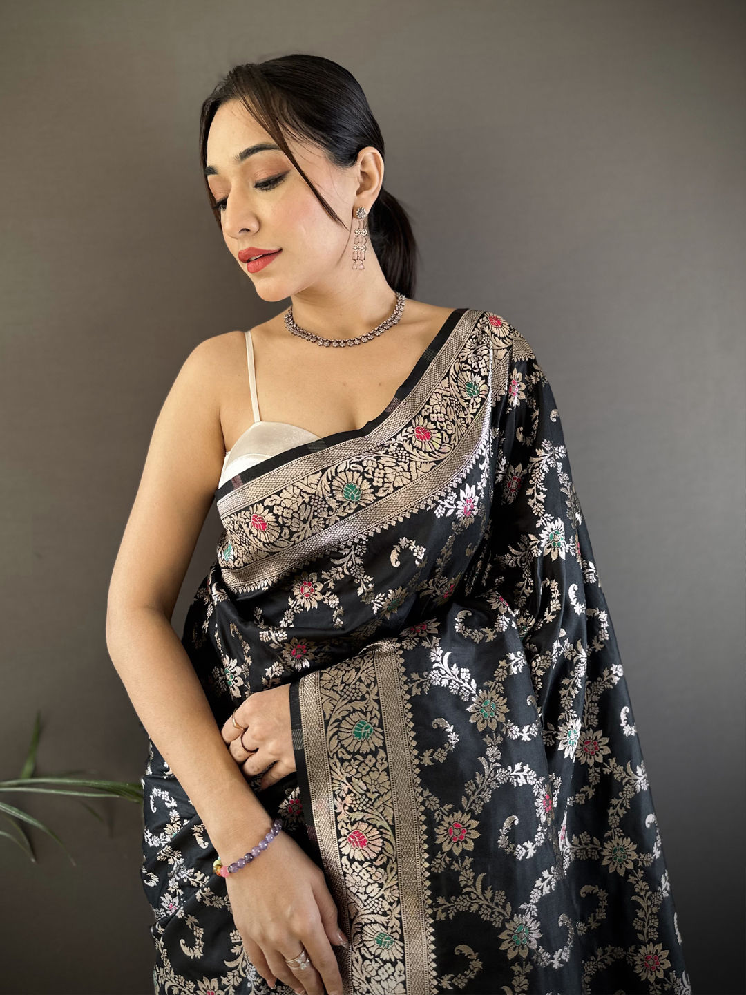 Black and Grey color Saree in Banarasi Silk fabric with Weaving work