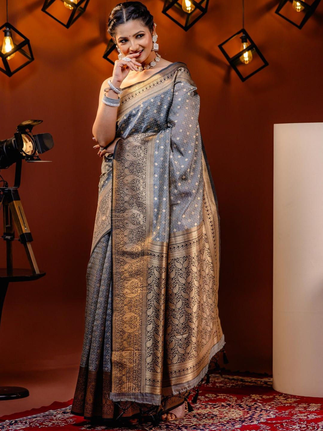 Black and Grey color Saree in Banarasi Silk fabric with Weaving work