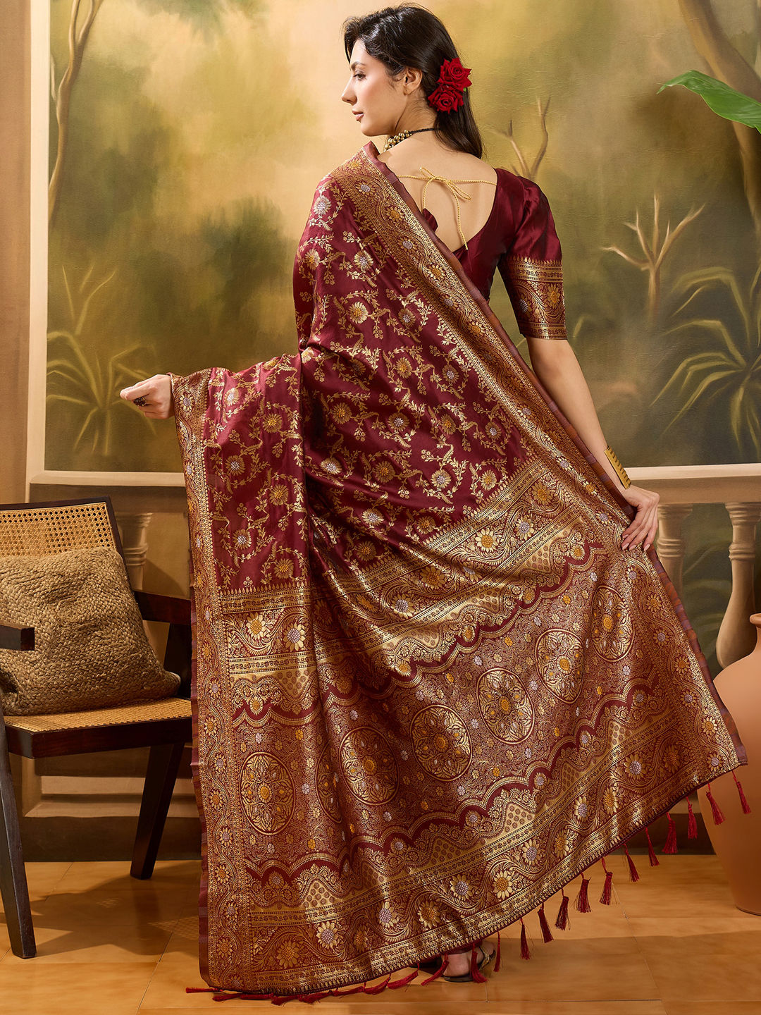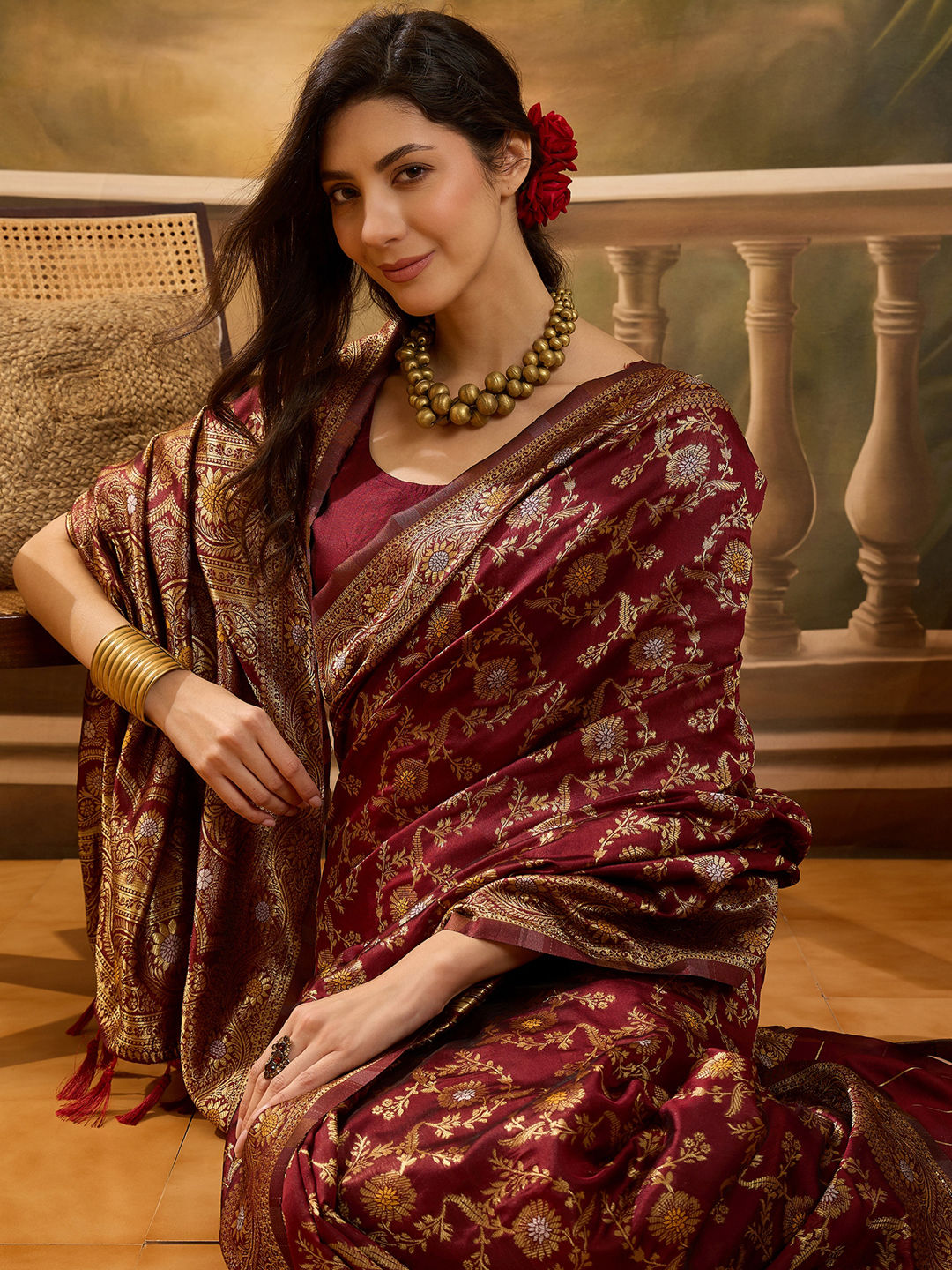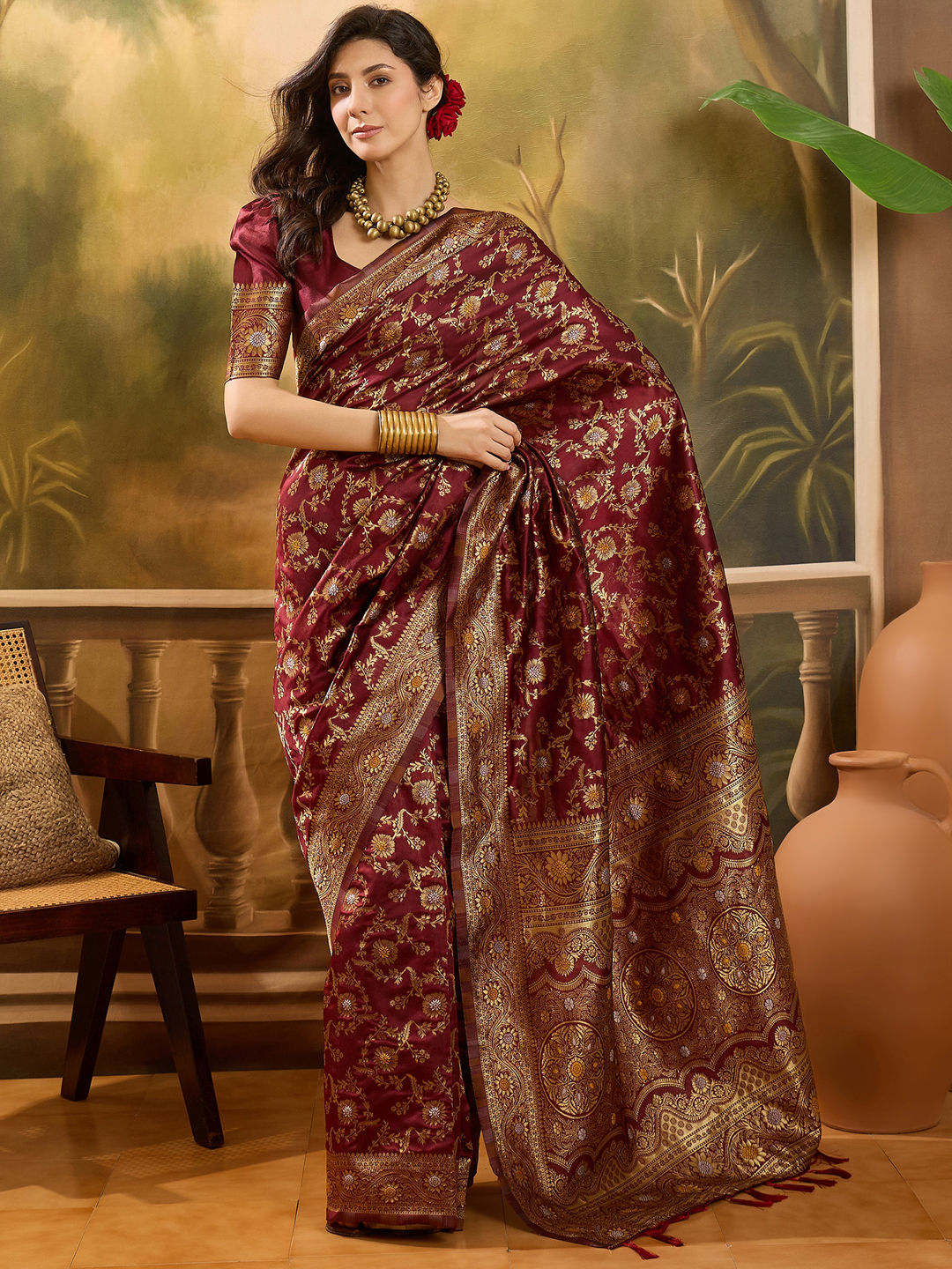 Jacquard Traditional Saree in Red and Maroon with Weaving work