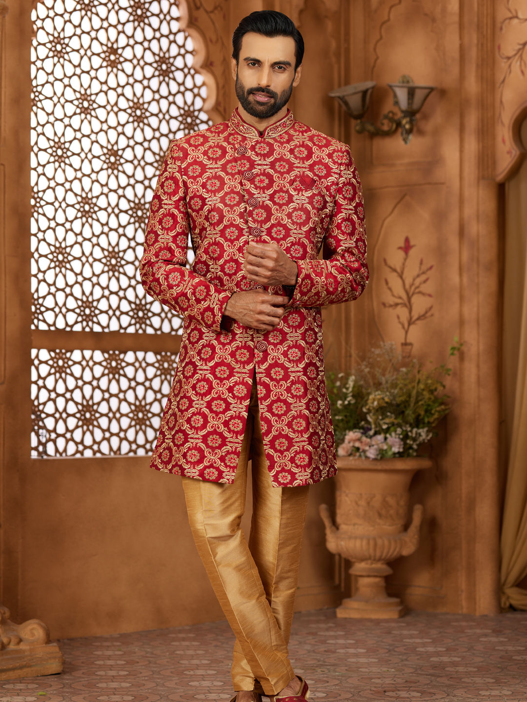 Red and Maroon color IndoWestern Dress in Banarasi Silk fabric with Bugle Beads, Embroidered, Thread work