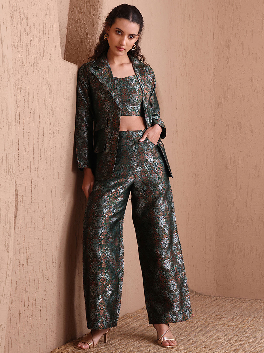 Green color Co-ords Set in Banarasi Silk fabric with Weaving work