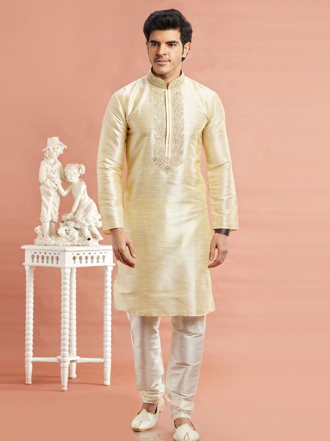 Banarasi Silk Festive Kurta Pyjamas in White and Off White with Embroidered work
