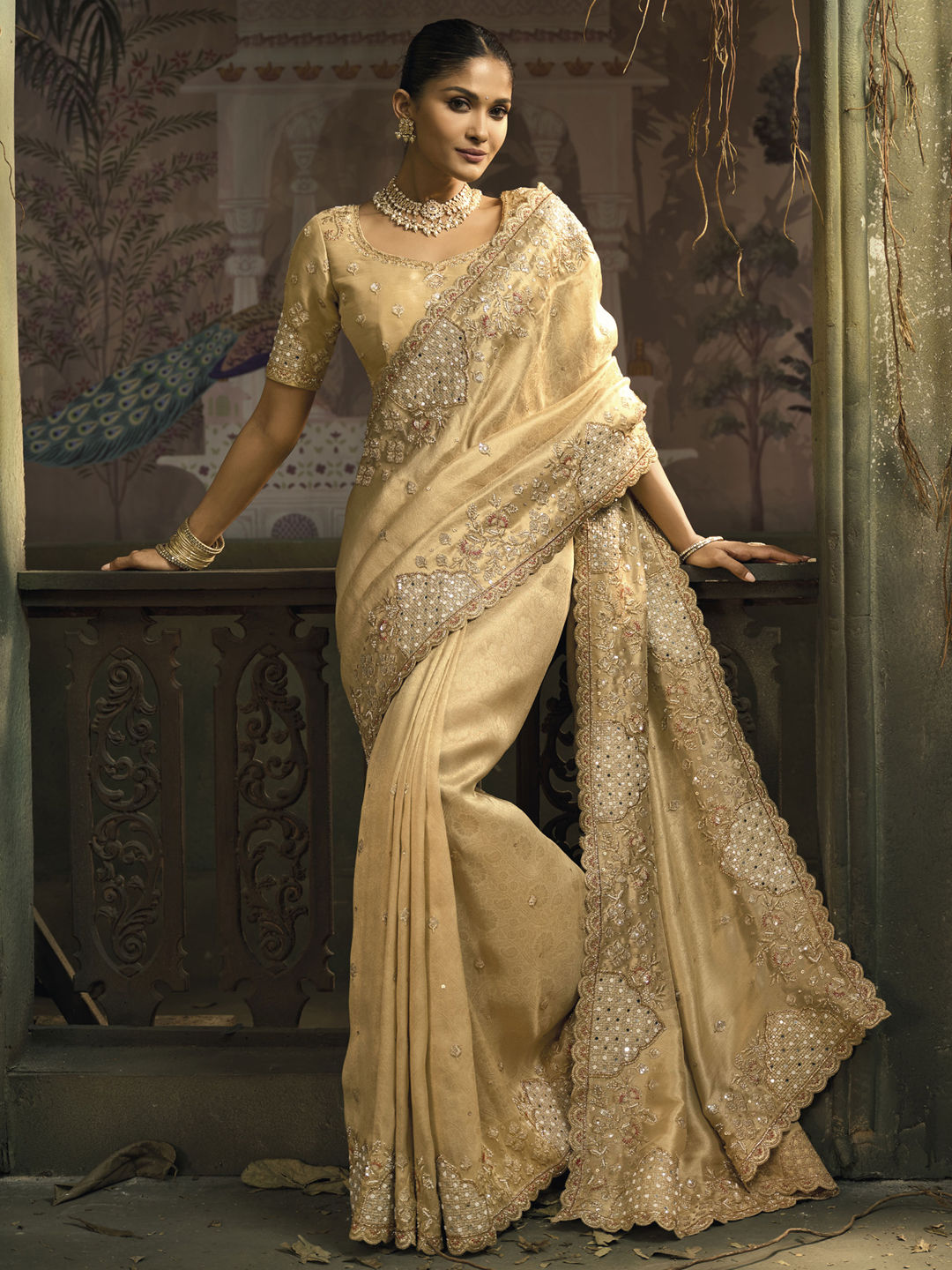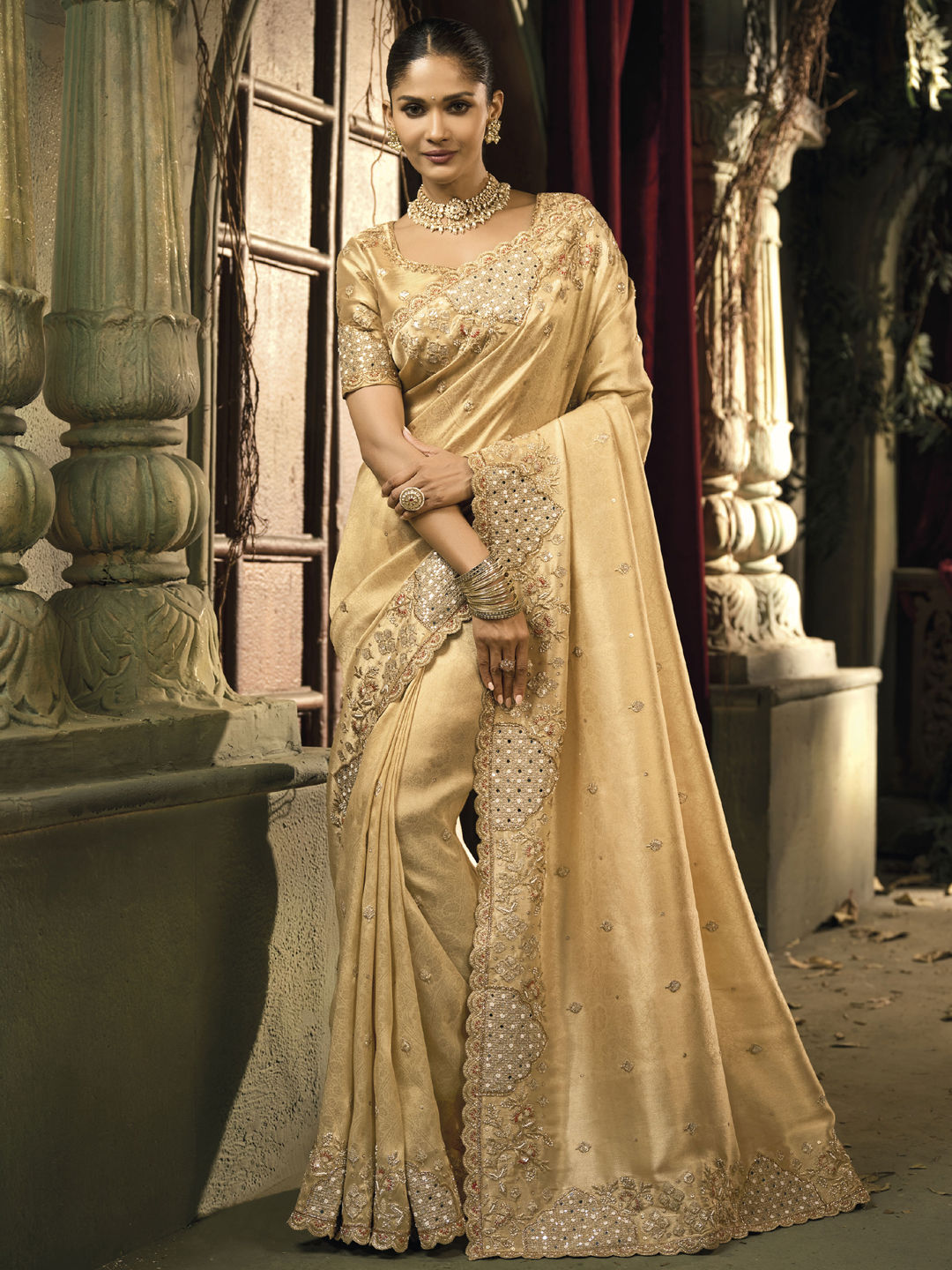 Description: Beige and Brown color Saree in Banarasi Silk fabric with Border, Cut Dana, Embroidered, Mirror, Moti, Thread, Zari work
