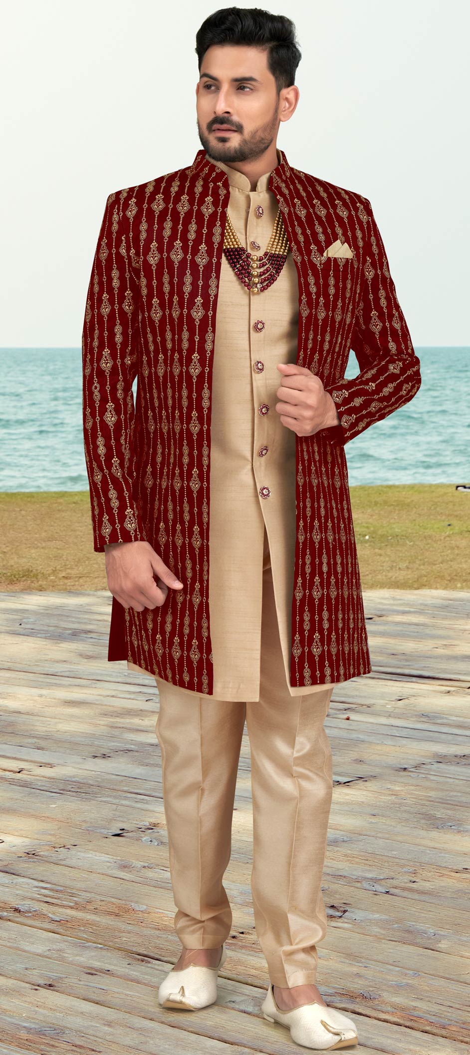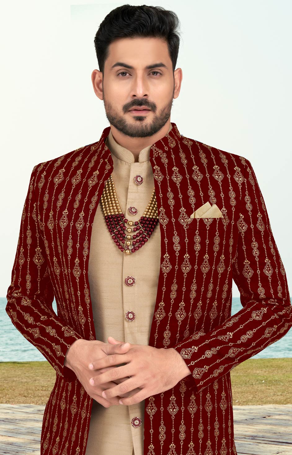 Banarasi Silk Wedding IndoWestern Dress in Red and Maroon with Thread work
