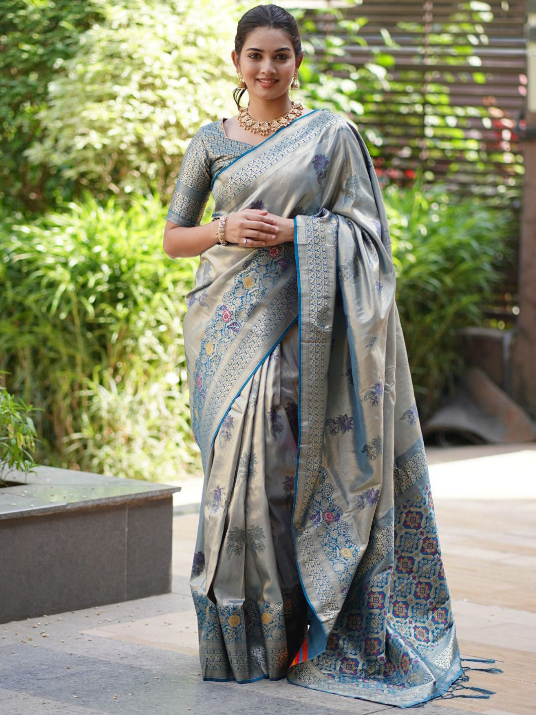 Black and Grey color Saree in Banarasi Silk fabric with Thread, Zari work