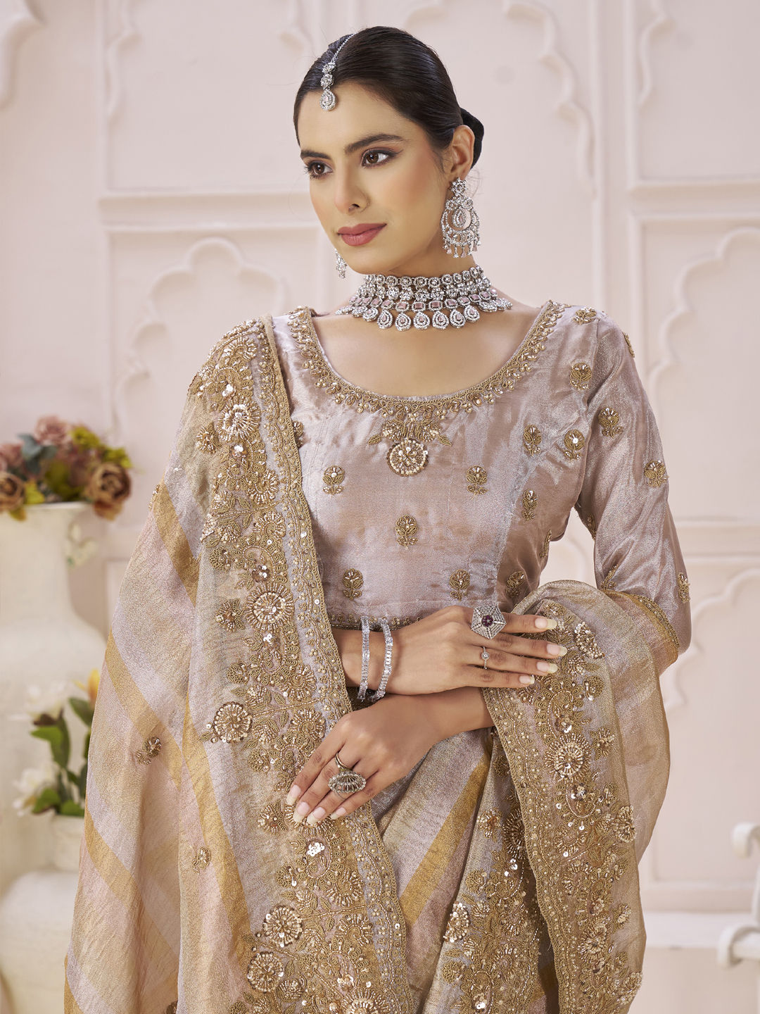 Organza Silk Bridal Saree in Beige and Brown with Bugle Beads work