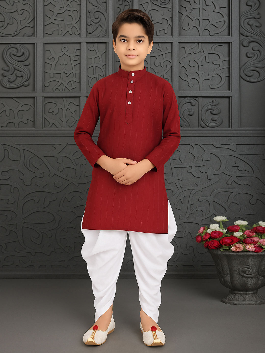Red and Maroon color Boys Kurta Pyjama in Blended Cotton fabric with Thread work