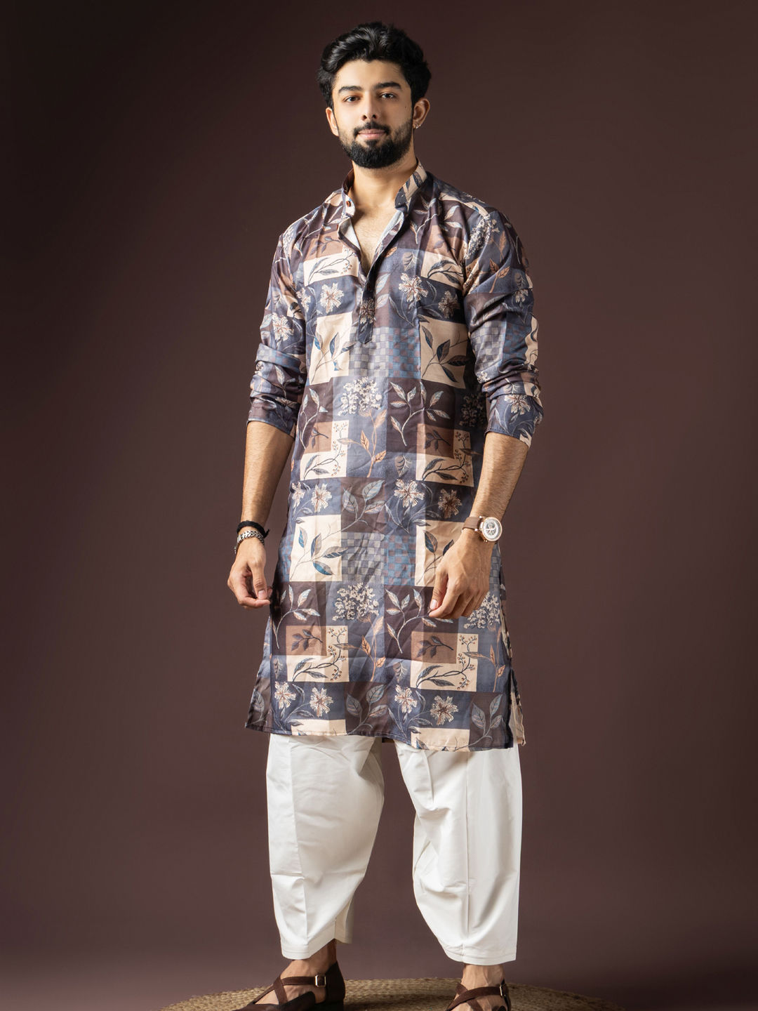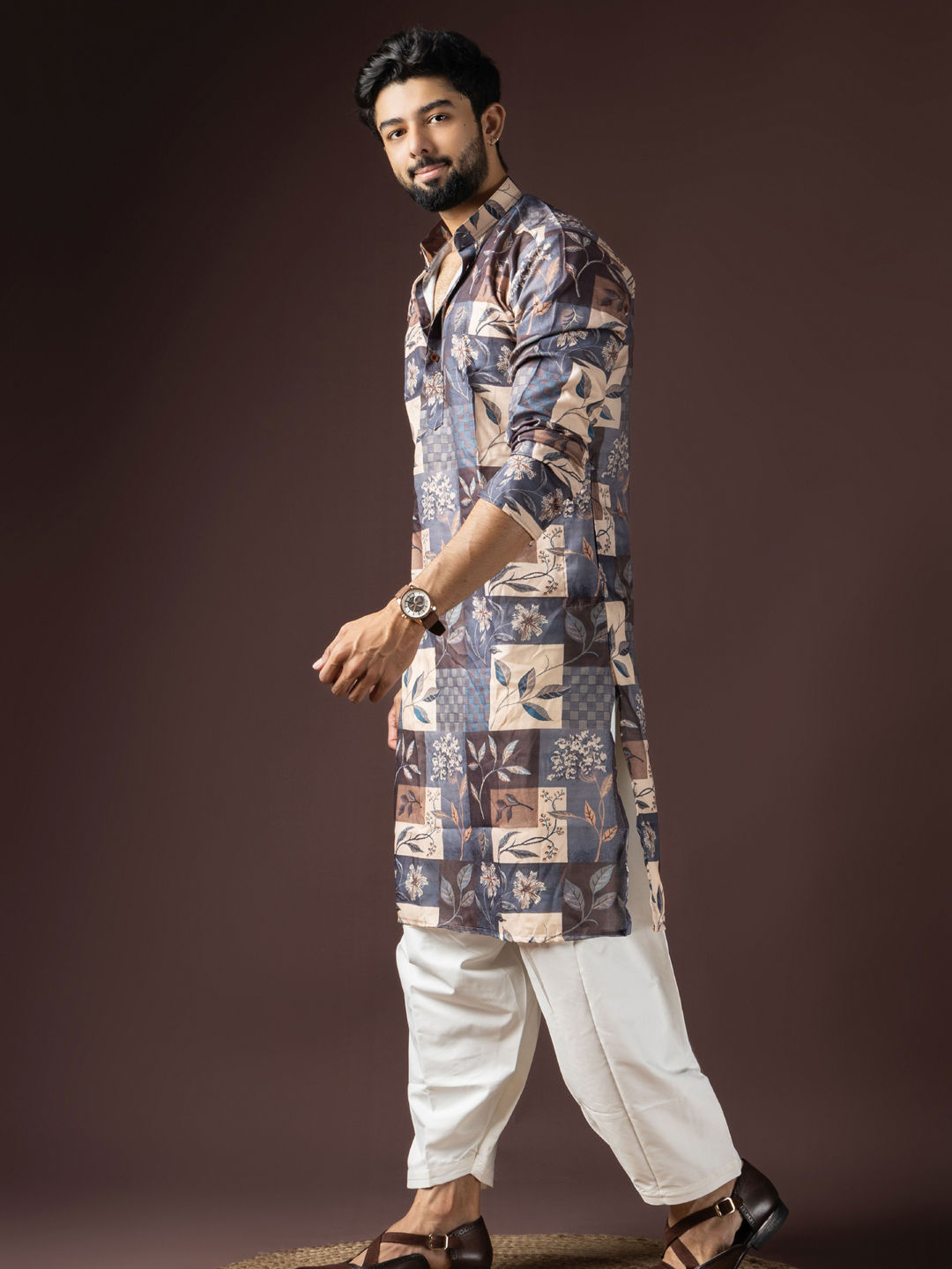 Blended Cotton Wedding Kurta Pyjamas in Beige and Brown with Printed work