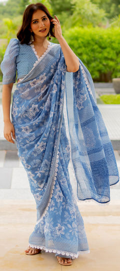 Blended Cotton Party Wear Saree in Blue with Printed work
