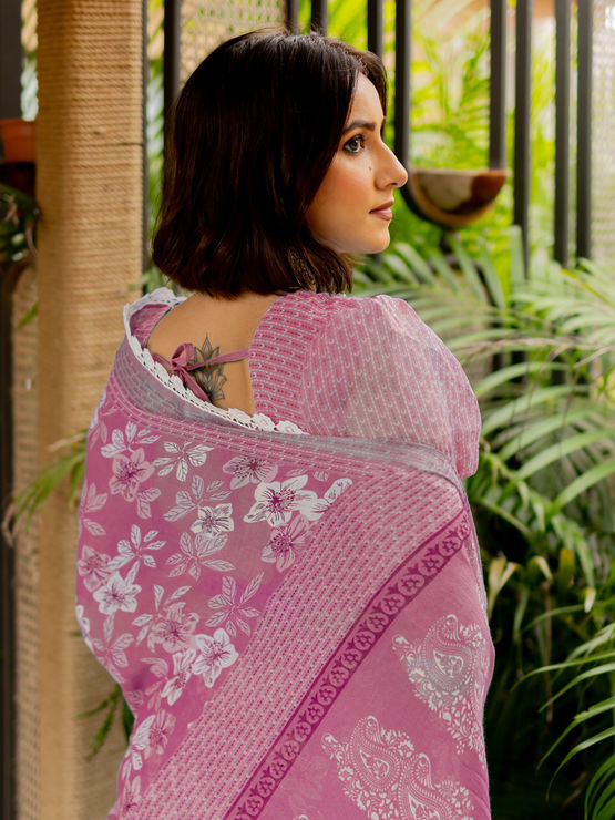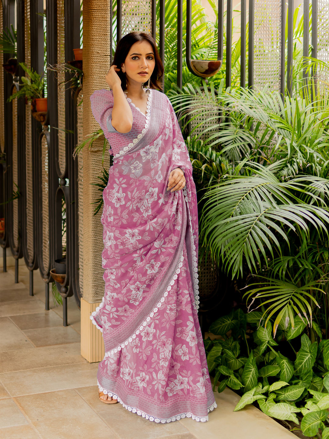 Pink and Majenta color Saree in Blended Cotton fabric with Floral, Lace, Printed work