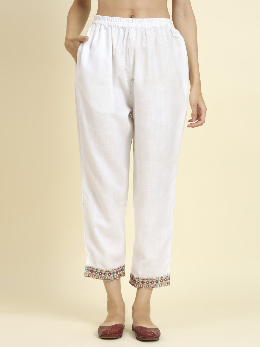 White and Off White color Salwar Kameez in Blended Cotton fabric with Embroidered, Mirror, Resham, Sequence, Thread work