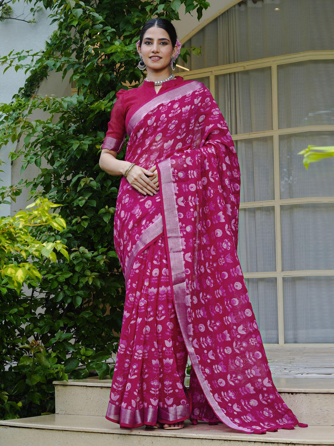 Pink and Majenta color Saree in Blended Cotton fabric with Floral, Printed work