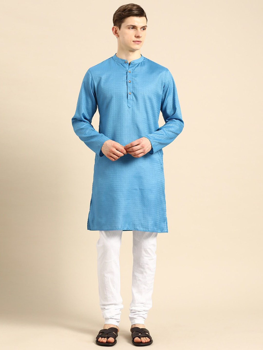 Blue color Kurta Pyjamas in Blended Cotton fabric with Weaving work