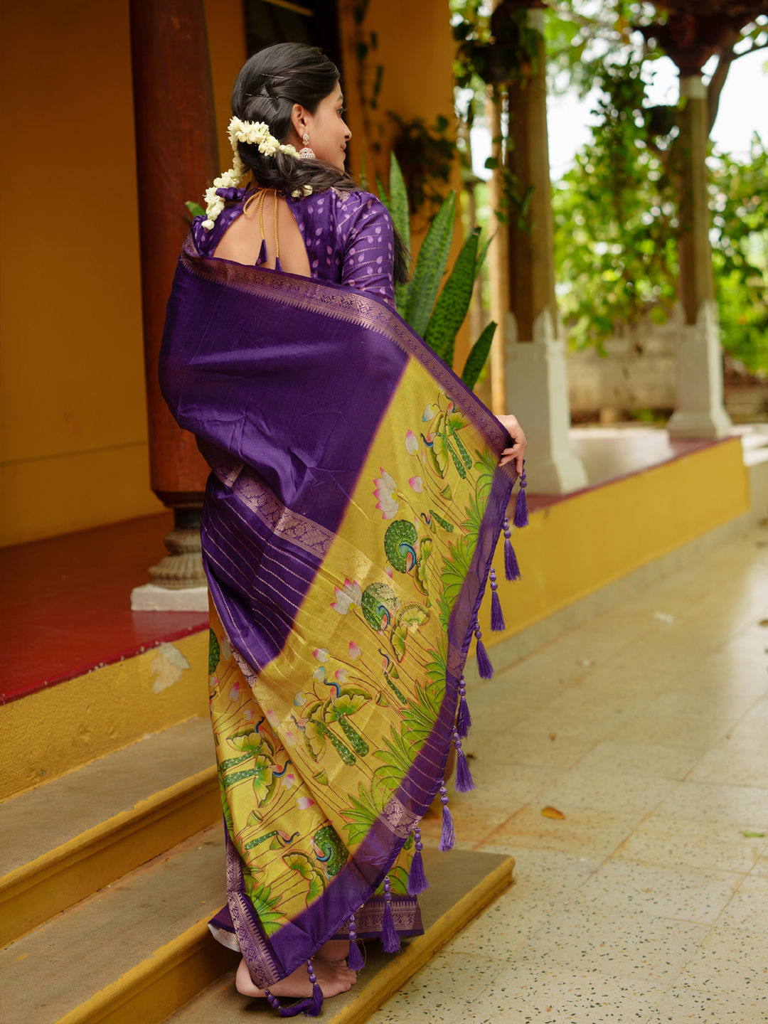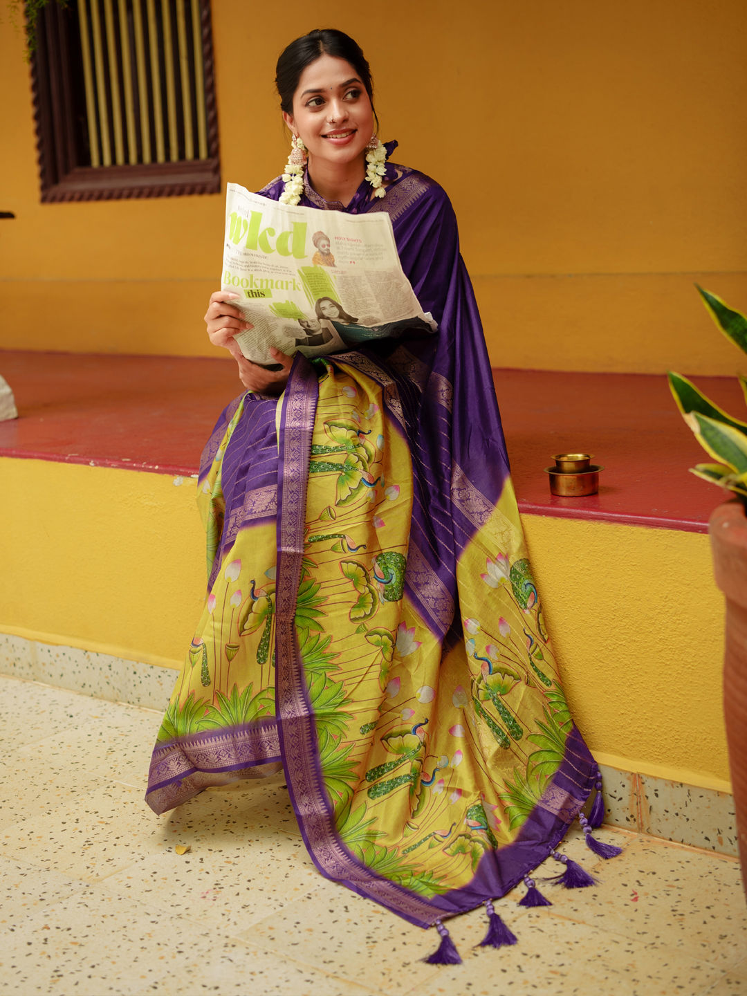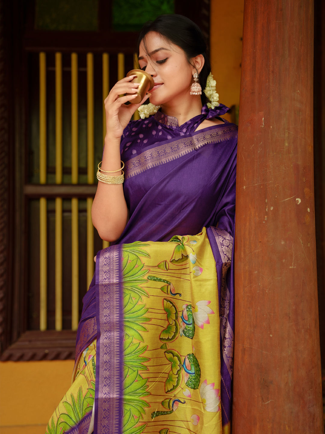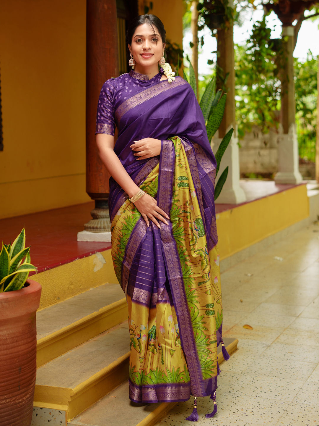 Blended Cotton Party Wear Saree in Yellow with Printed work