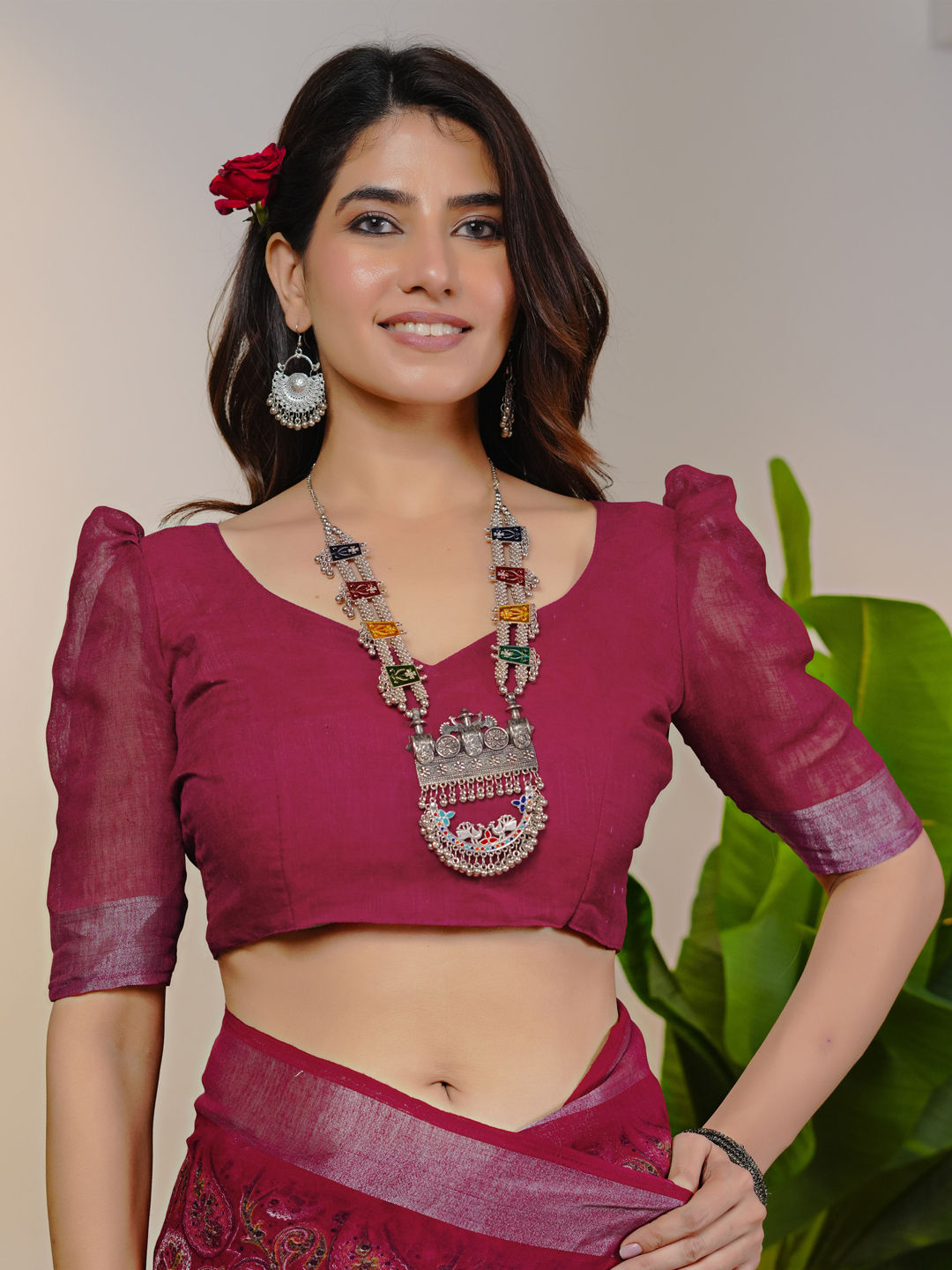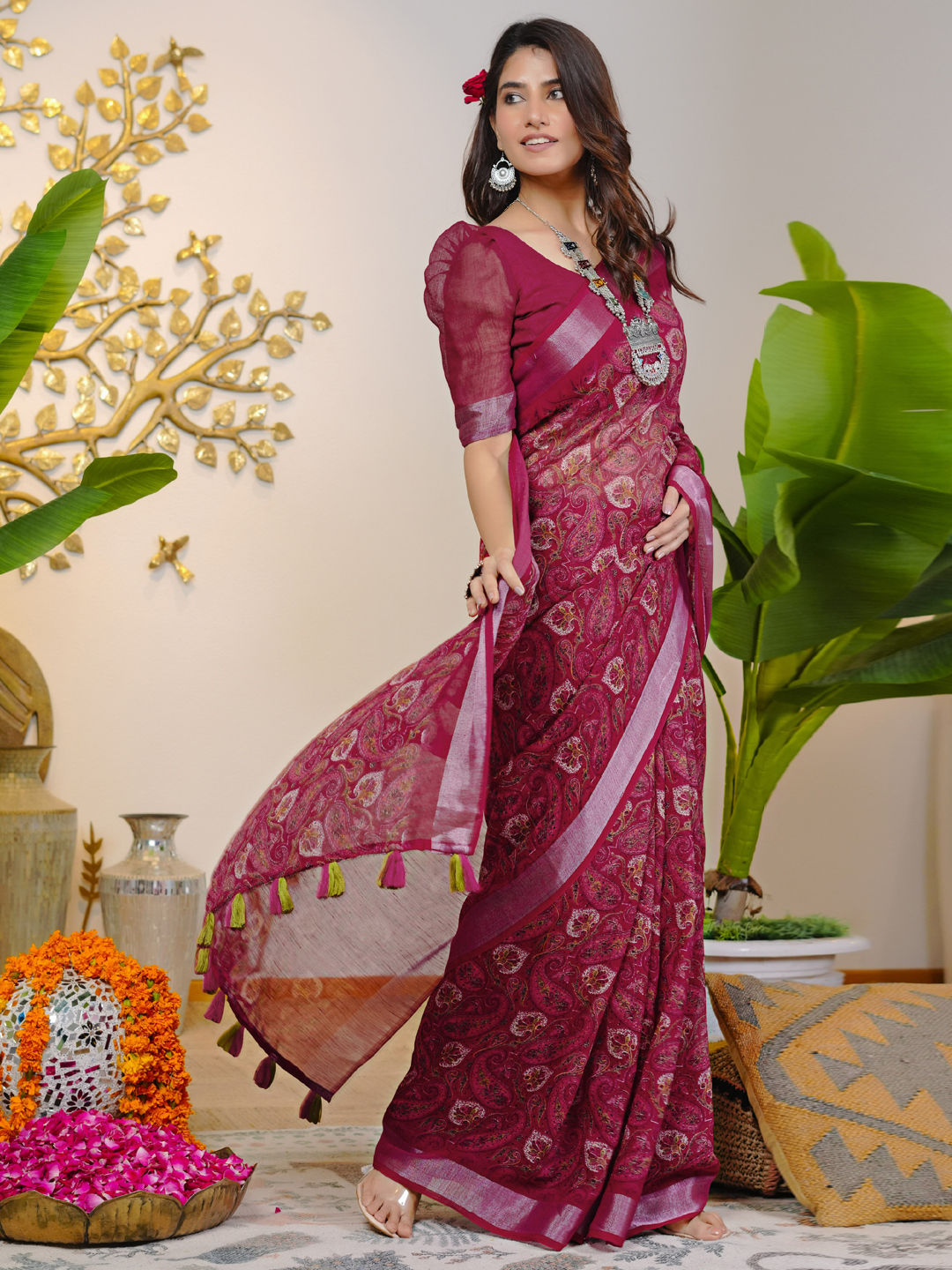 Blended Cotton Party Wear Saree in Red and Maroon with Floral work