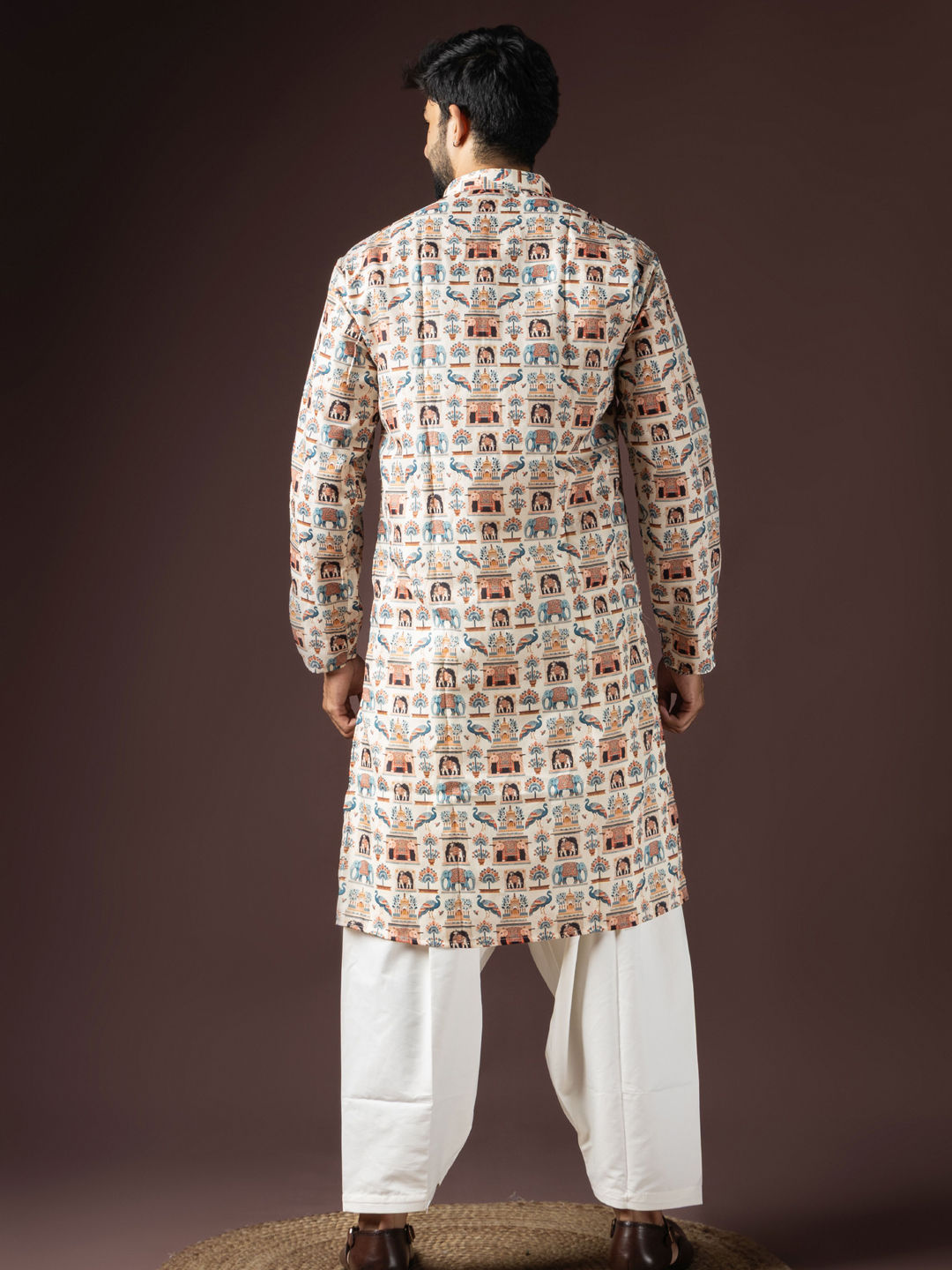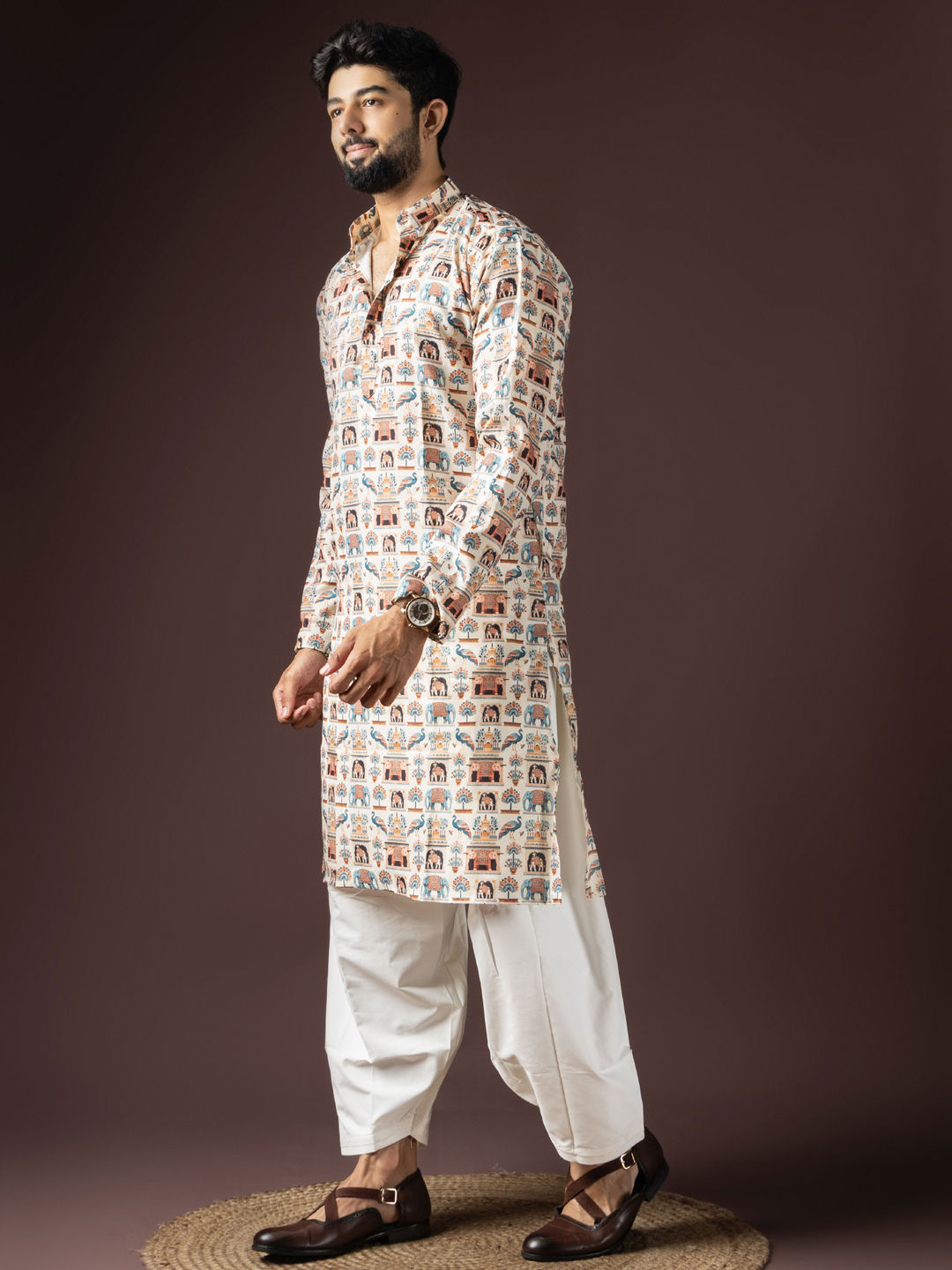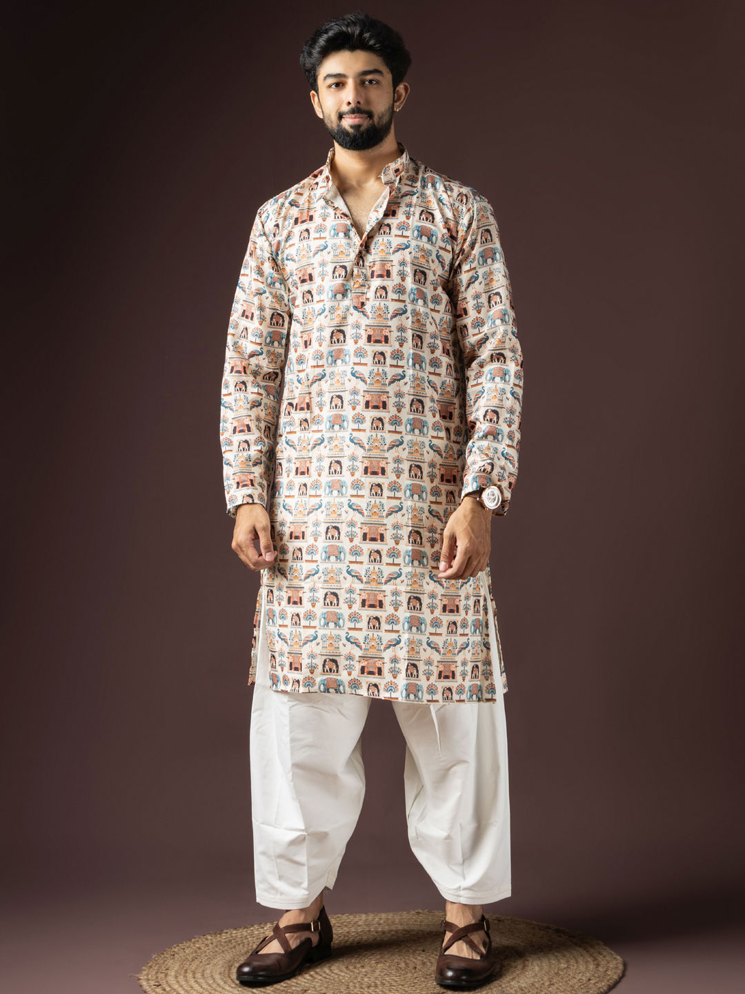 Blended Cotton Festive Kurta Pyjamas in Multicolor with Printed work